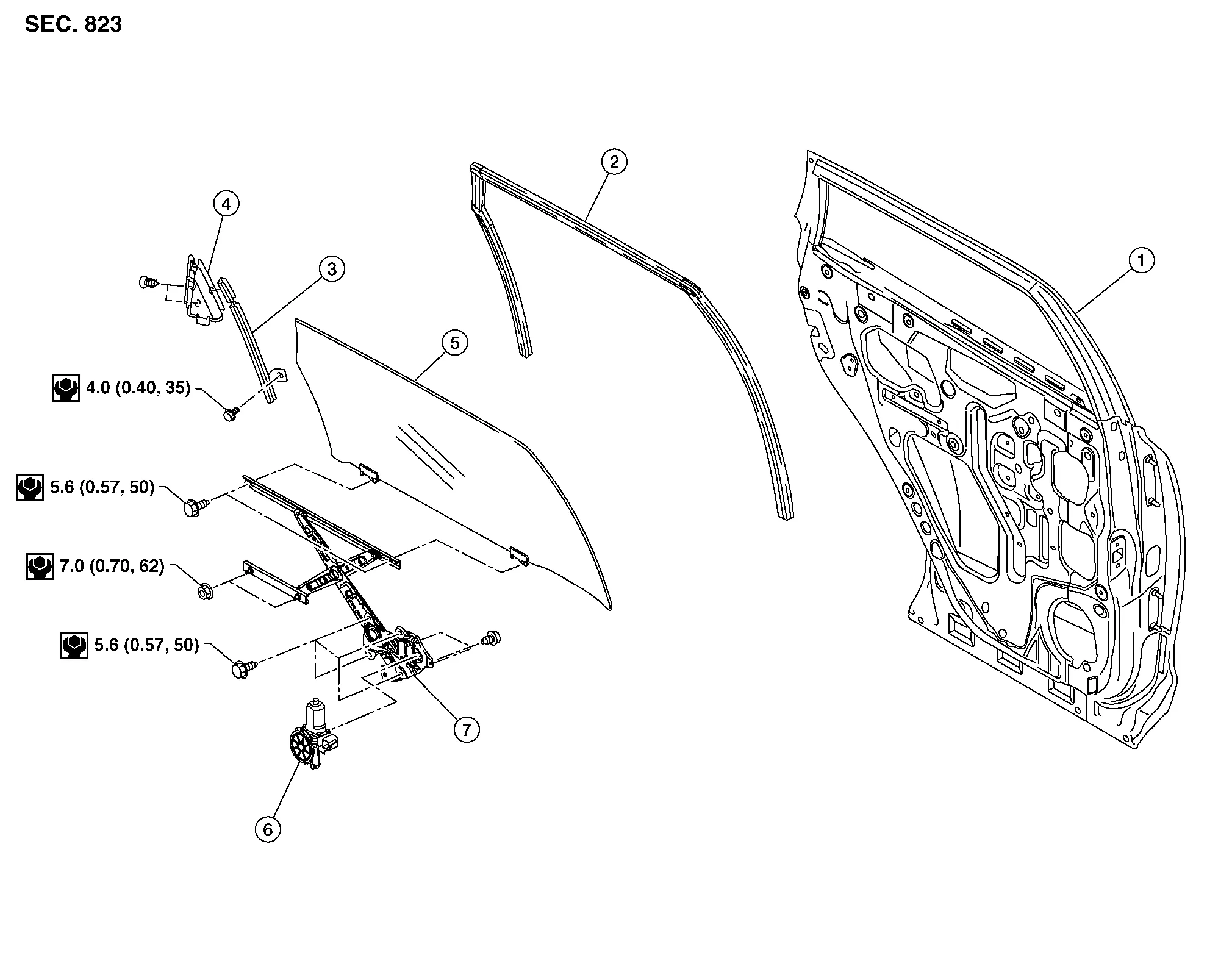 | 4. | Rear door glass corner finisher | 5. | Rear door glass | 6. | Rear door glass power window motor |
