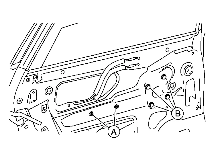 Remove bolts (B) and nuts (A) from rear door glass regulator.
