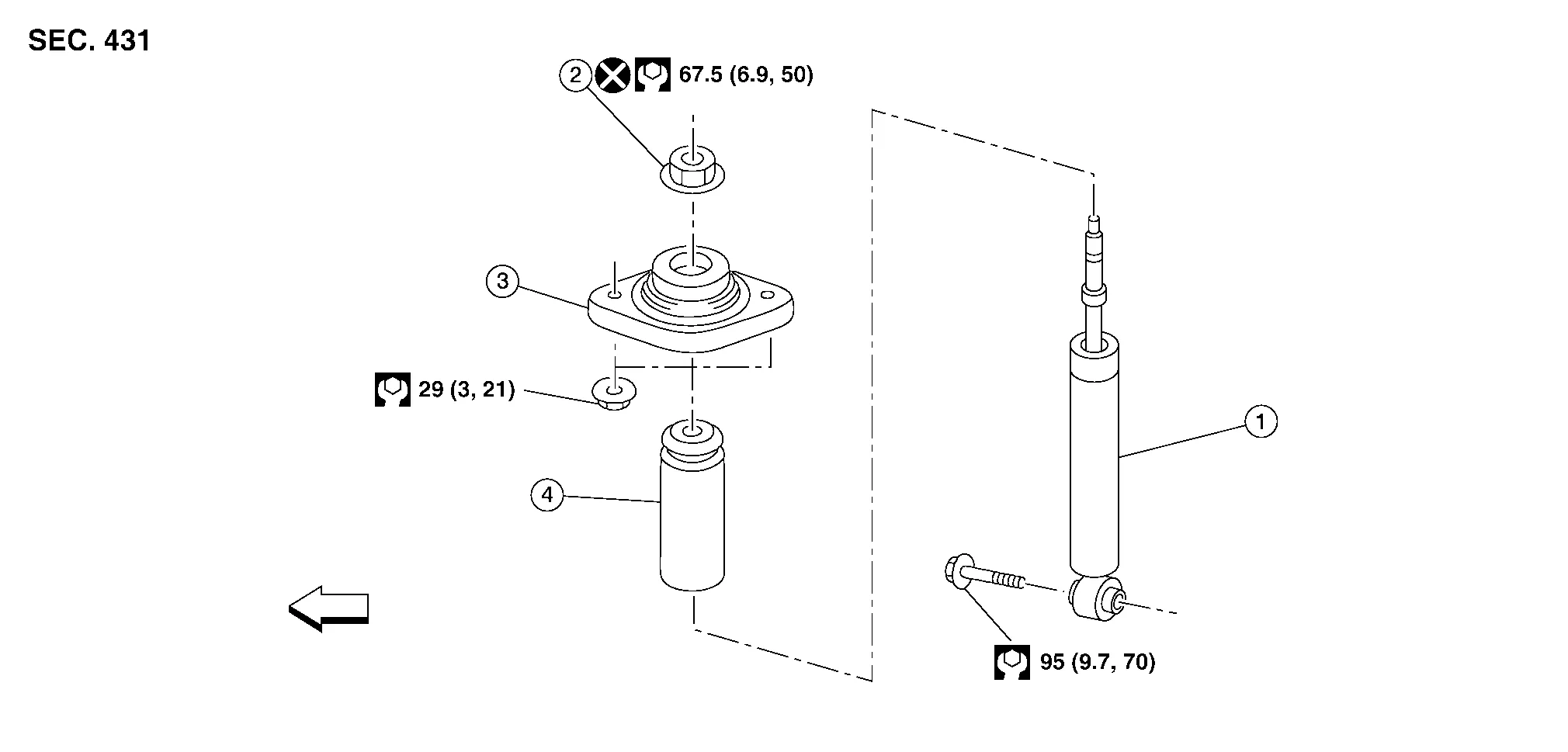 | 1. | Rear shock absorber | 2. | Piston rod lock nut | 3. | Shock absorber insulator |