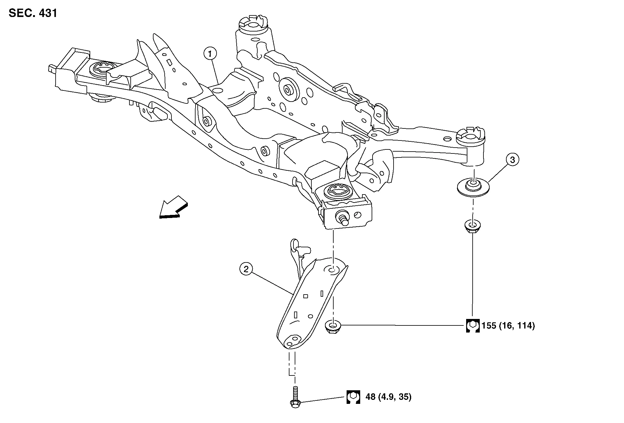 | 1. | Rear suspension member | 2. | Rear suspension member stay | 3. | Rear suspension member stopper |