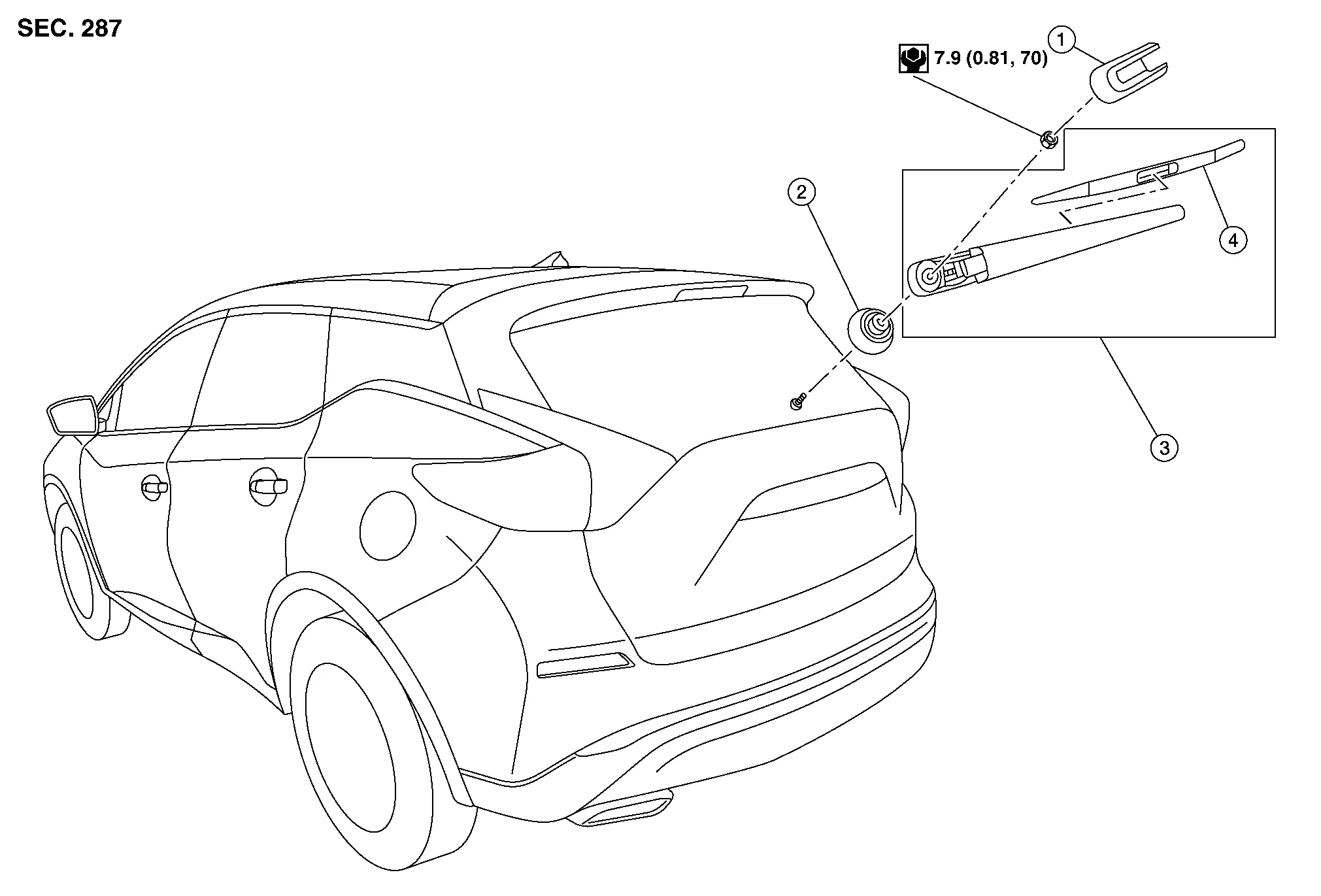 | 1. | Rear wiper arm cover | 2. | Seal | 3. | Rear wiper arm assembly |