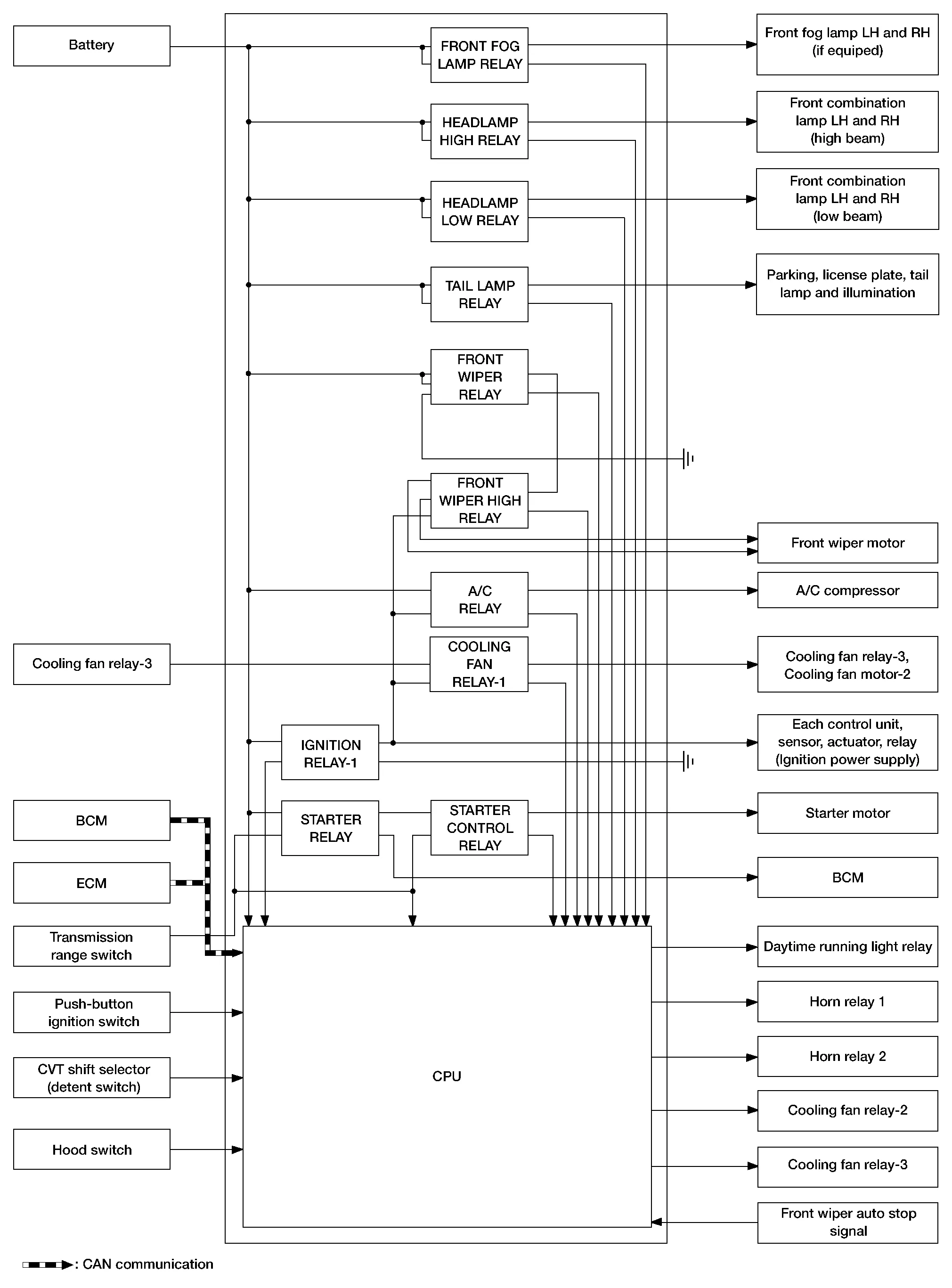 | Starter relay | Starter relay signal | BCM (CAN) | Starter motor | System Description |