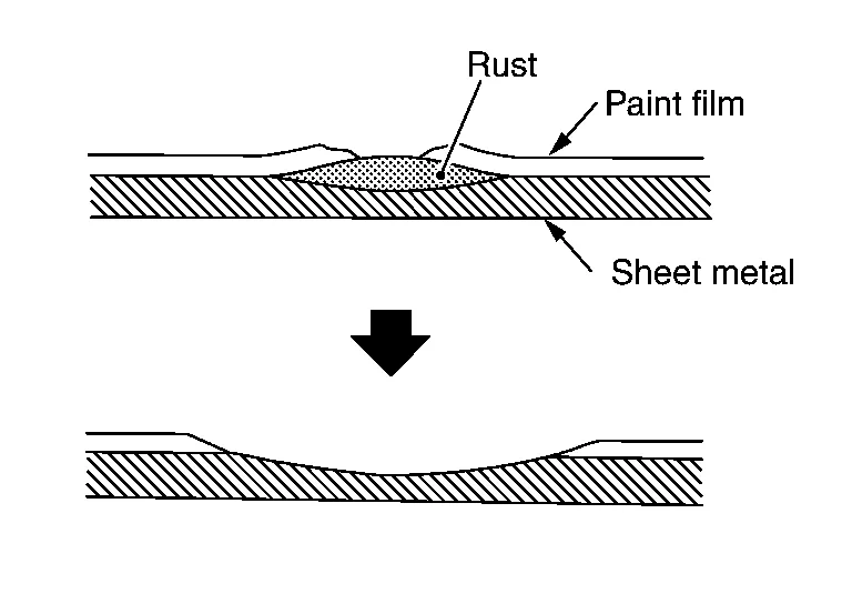 Rust on sheet metal is the result of the chemical reaction of steel to oxygen in the air, which is called oxidation. This rust, if left untreated, will increase and finally corrode and damage the sheet metal. If the Nissan Murano vehicle is used for a long time under severe environmental conditions, rust or corrosion may form on body surfaces. When repairing rust and corrosion, it is necessary to keep rust from spreading from the repaired portion.