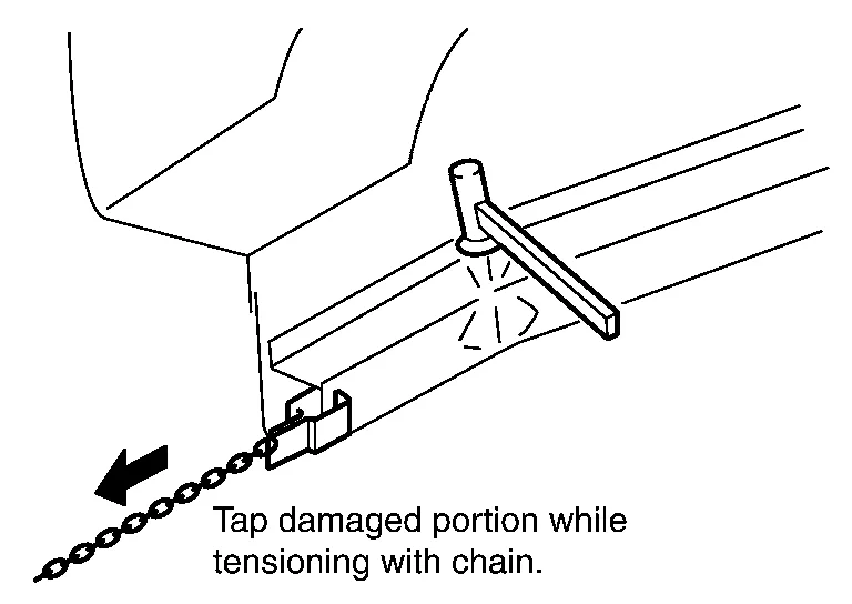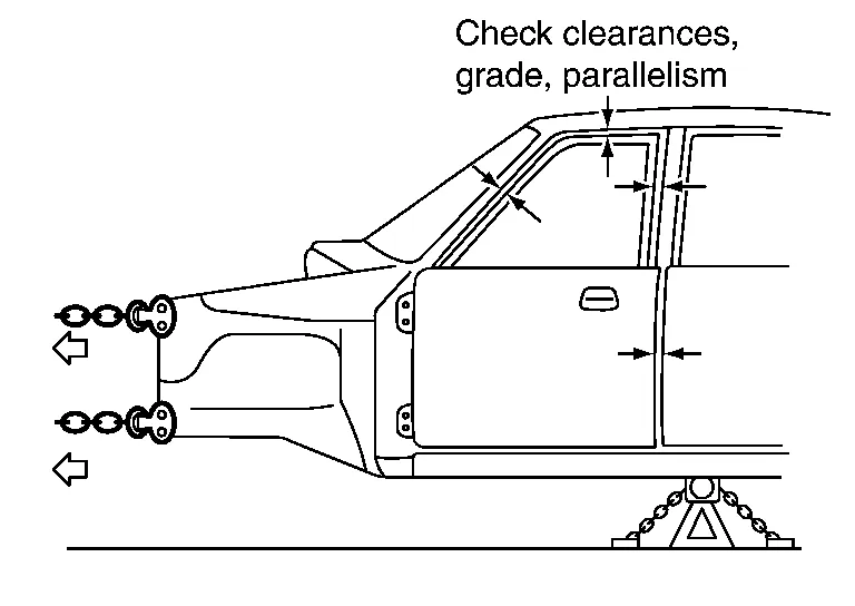Pulling work must be performed with care taken not to damage the anchoring points or undamaged area of the body. If area not targeted for repair is affected by the excessive pulling force or the direction of pulling, additional anchoring points need to be provided to protect undamaged areas. Side sills are strong enough against longitudinal force, however, they are easily damaged by downward or lateral force. For this reason, additional anchoring should be provided by supporting side members with the port power, or attaching a clamp and chain.