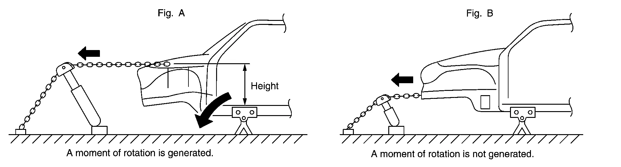 Note that if there is distance between the pulling point and the underbody clamp, as indicated by (A) in the figure, a moment of rotation is produced.