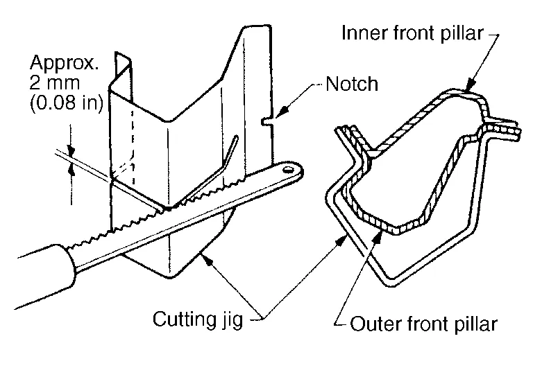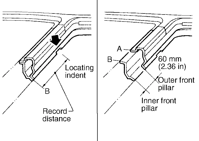 Determine cutting position and record distance from the locating indent. Use this distance when cutting the service part. Cut outer front pillar over 60 mm (2.36 in) above the inner front pillar cut position.