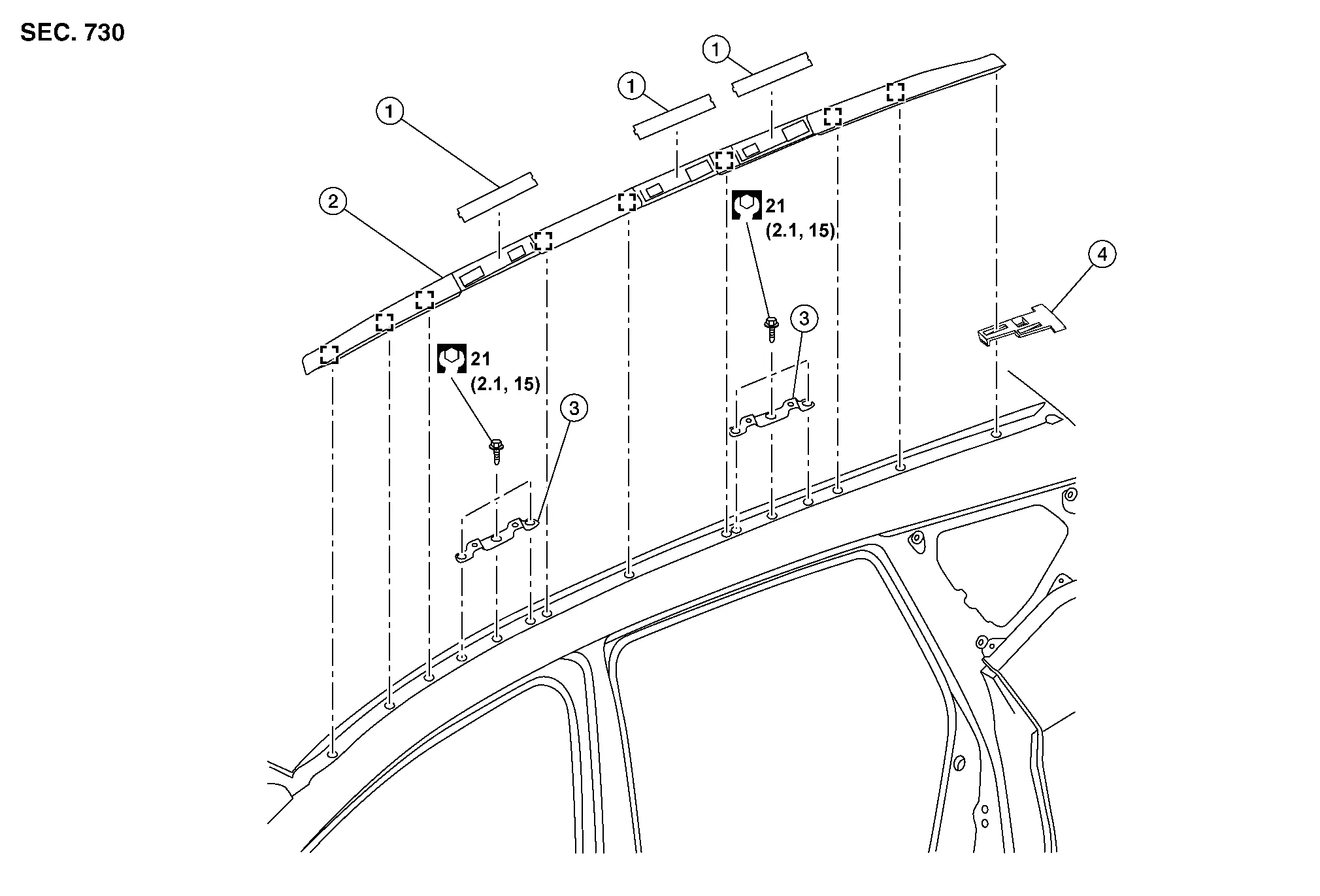 REMOVALBeginning at the front of the vehicle, release roof side molding (1) metal clips using a suitable tool (A) then remove...