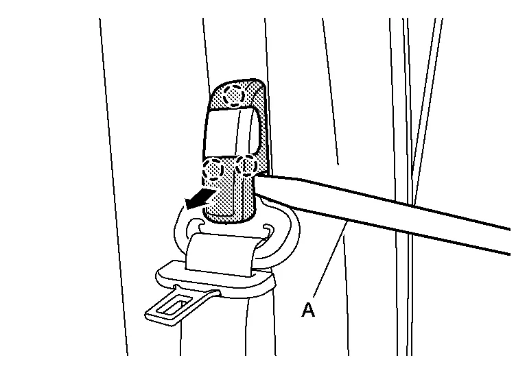 Release pawls, using a suitable tool (A) and remove seat belt height adjuster bolt cover.