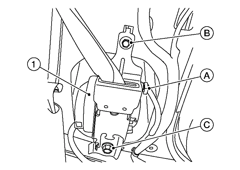 Disconnect harness connector (A) from seat belt pre-tensioner (1) then remove pre-tensioner bolts (B) and (C).