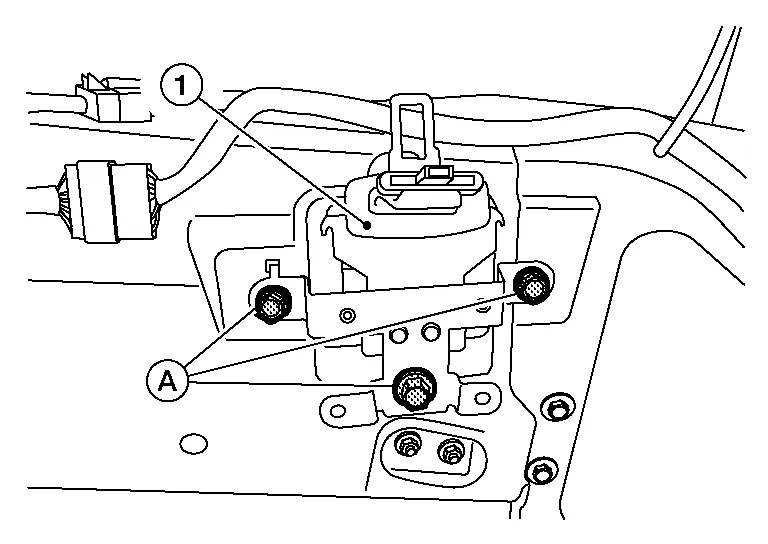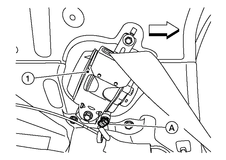 Remove seat belt retractor bolts (A) and (B), then remove seat belt retractor (1) from Nissan Murano vehicle.