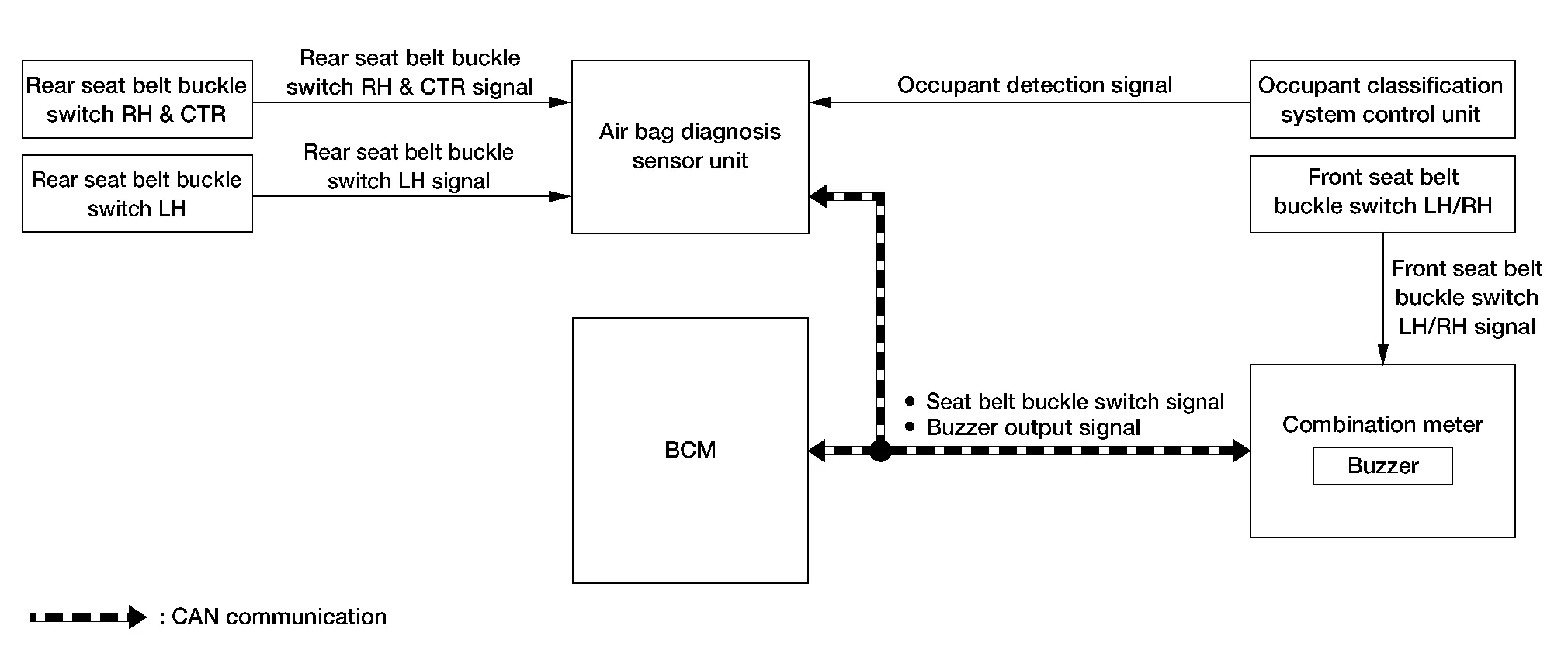 Rear seat belt buckle switch RH, LH or center Air bag diagnosis sensor unit Combination meter |