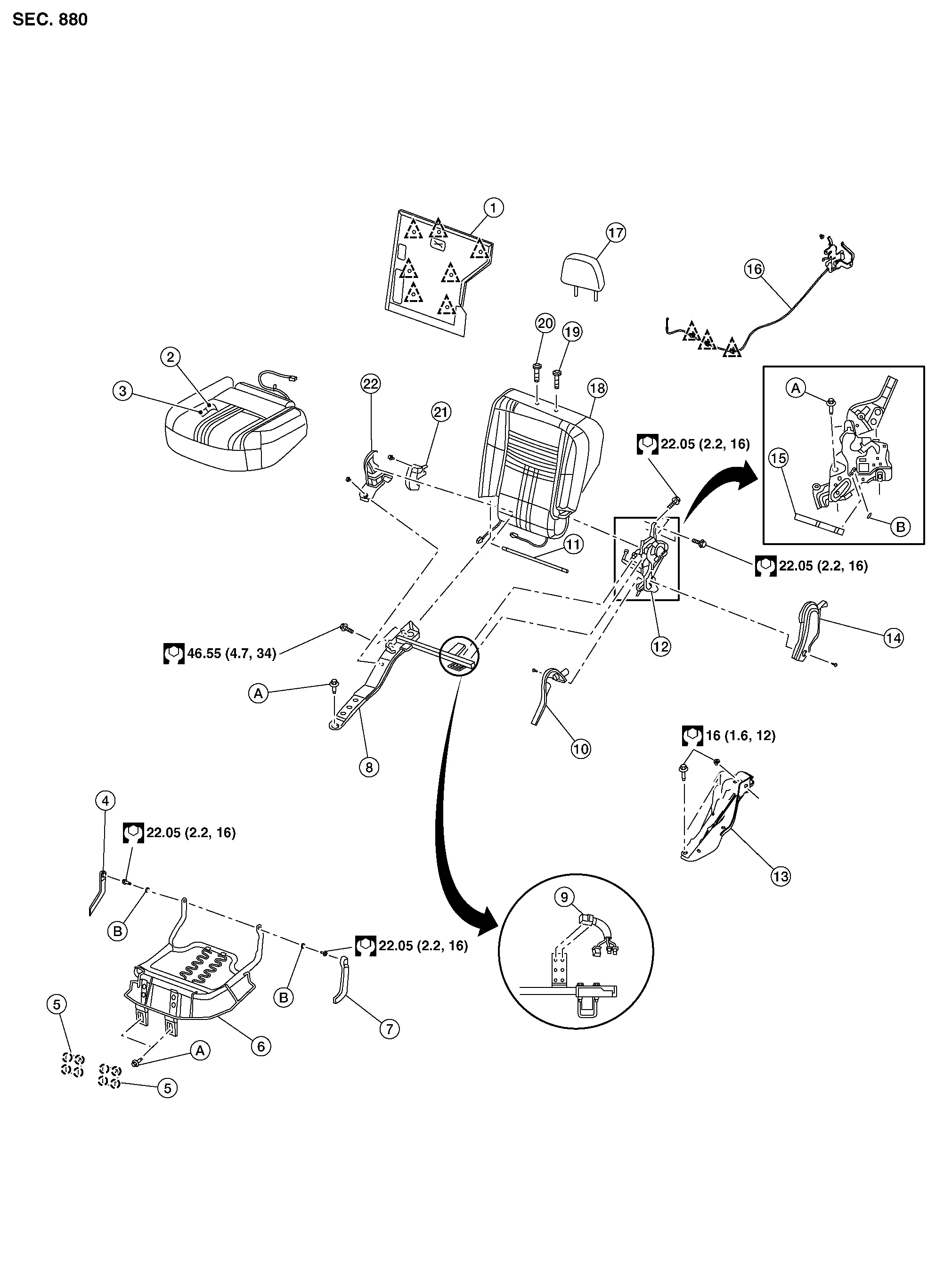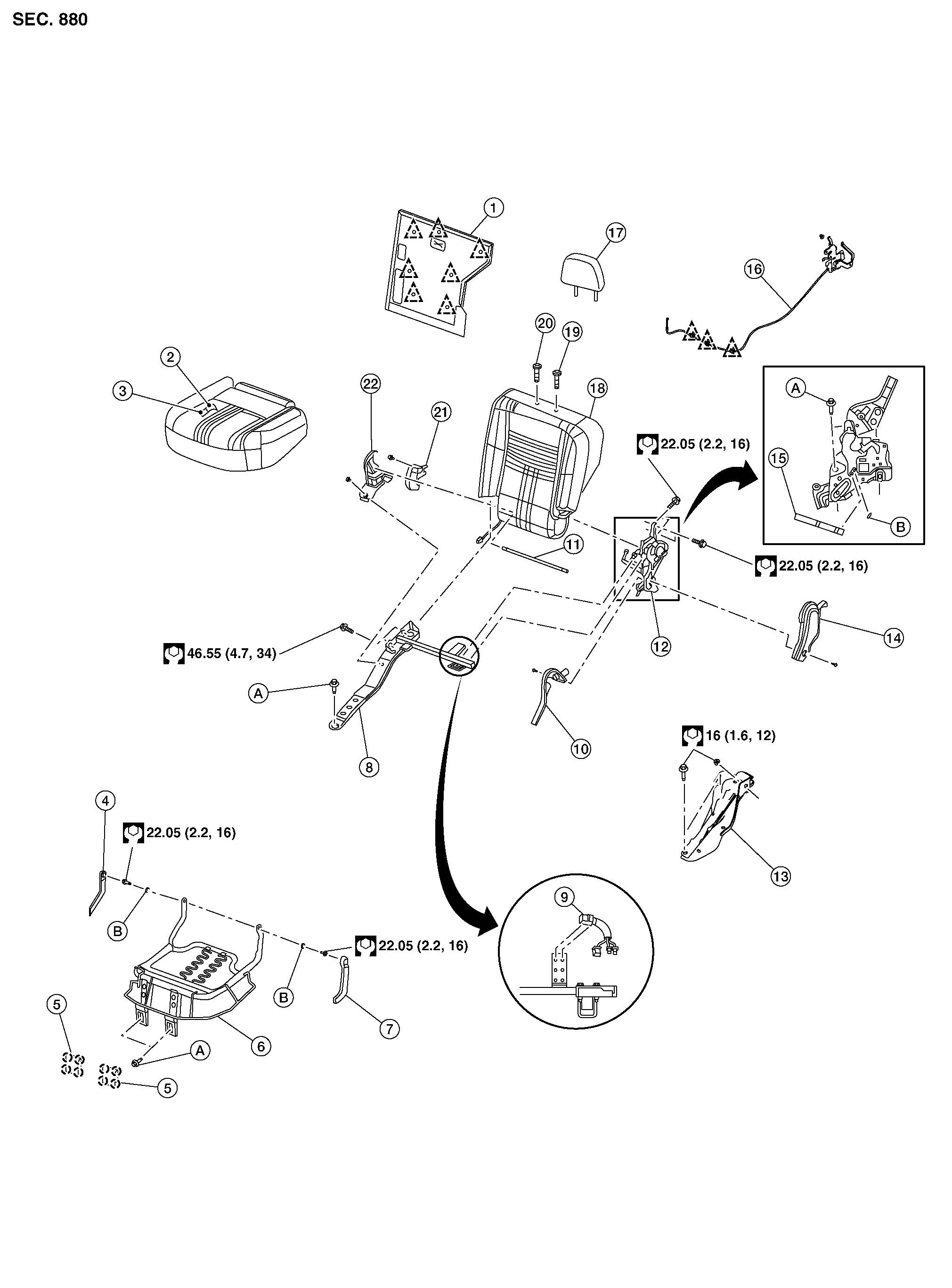 | 22. | Reclining device outer cover (RH) | A. | Refer to Removal and Installation. | B. | Grommet |