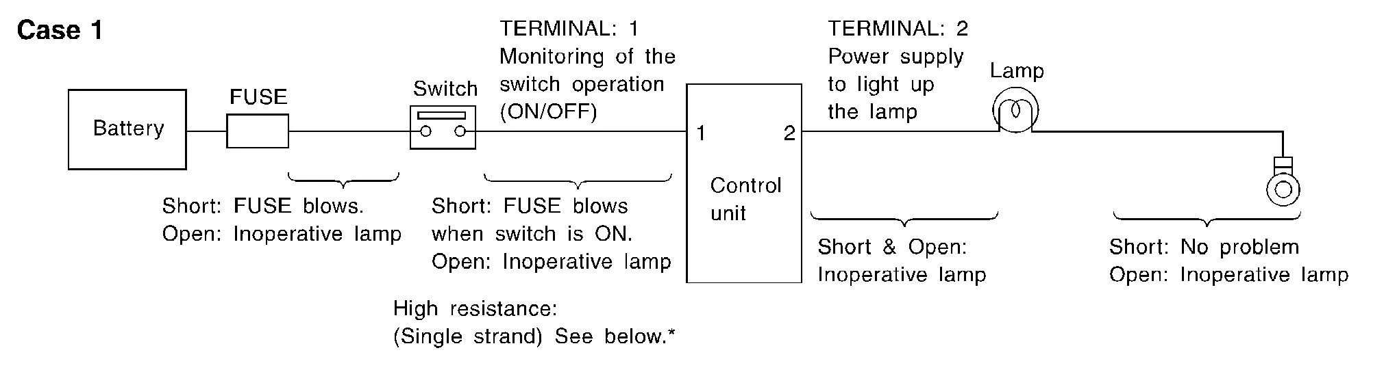 *: If high resistance exists in the switch side circuit (caused by a single strand), terminal 1 does not detect battery voltage. Control unit does not detect the switch is ON even if the switch does not turn ON. Therefore, the control unit does not supply power to light up the lamp.