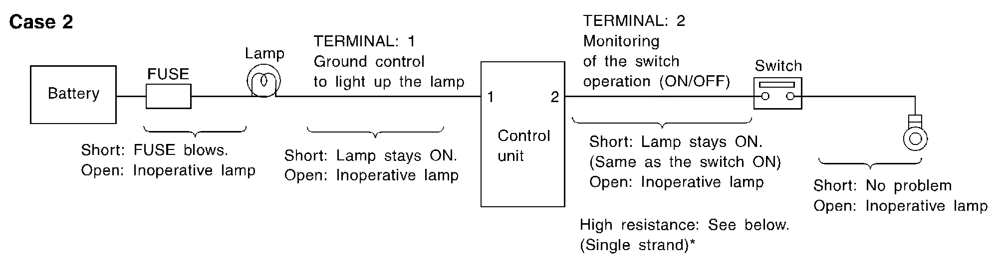 *: If high resistance exists in the switch side circuit (caused by a single strand), terminal 2 does not detect approx. 0 V. Control unit does not detect the switch is ON even if the switch does not turn ON. Therefore, the control unit does not control ground to light up the lamp.