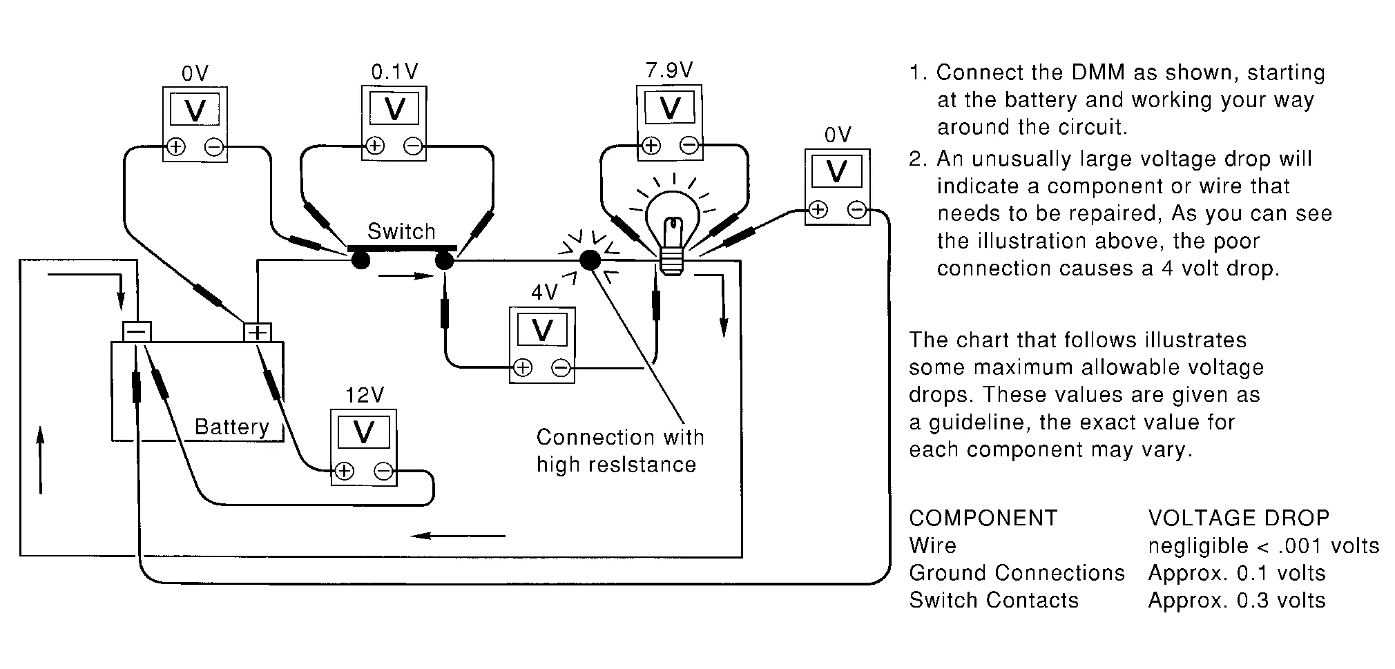 Note in the illustration that there is an excessive 4.1 volt drop between the battery and the bulb.