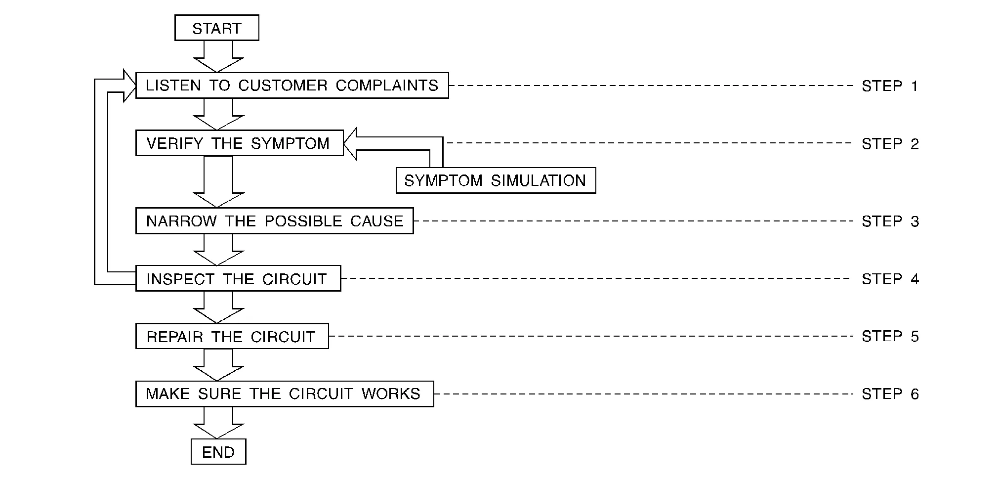 | STEP 6 | Operate the system in all modes. Verify the system works properly under all conditions. Check you have not inadvertently created a new incident during your diagnosis or repair steps. | |