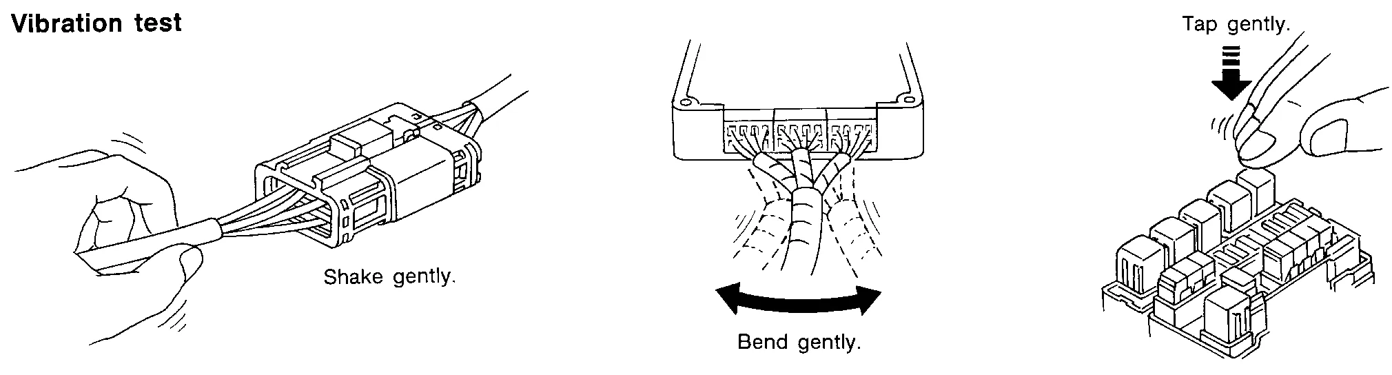 Determine which connectors and wiring harness would affect the electrical system you are inspecting. Gently shake each connector and harness while monitoring the system for the incident you are trying to duplicate. This test may indicate a loose or poor electrical connection.
