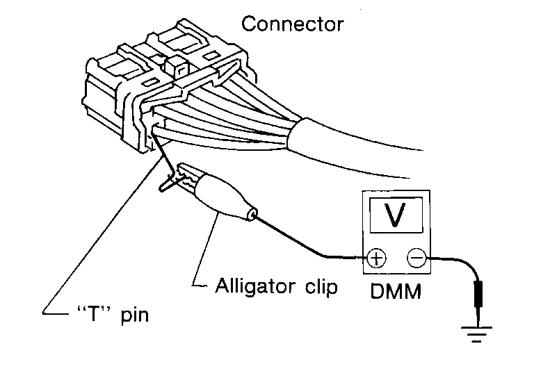 The probe of a digital multimeter (DMM) may not correctly fit the connector cavity. To correctly probe the connector, follow the procedures below using a “T” pin. For the best contact grasp the “T” pin using an alligator clip.