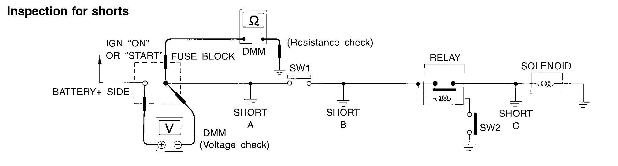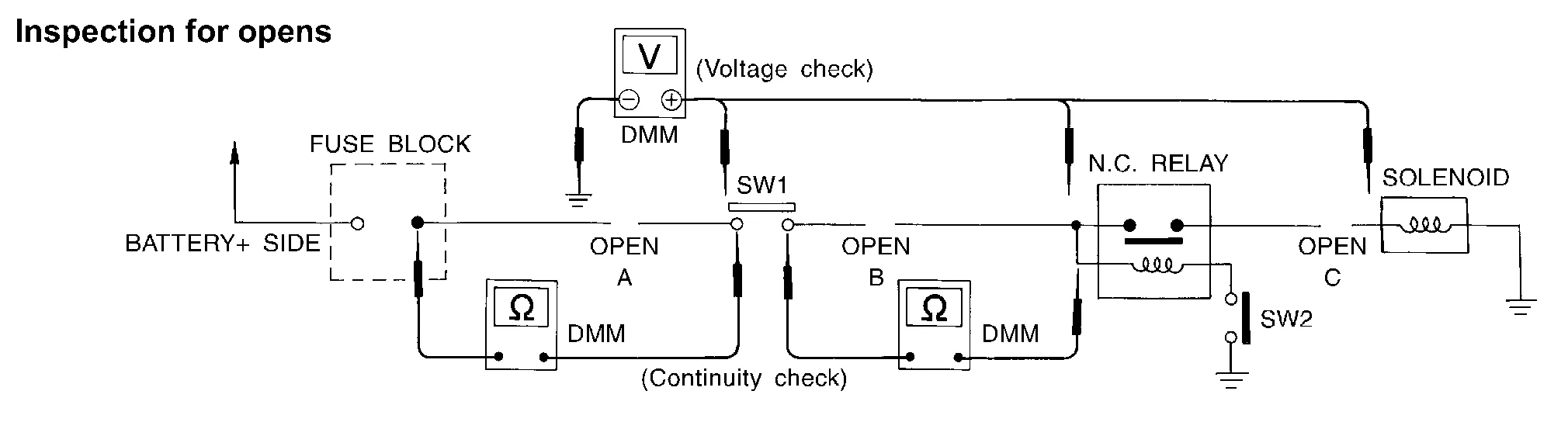 Connect the probes between the relay and the solenoid. Little or no resistance will indicate that portion of the circuit has good continuity. If there were an open in the circuit, the DMM would indicate an over limit or infinite resistance condition. (point C)
