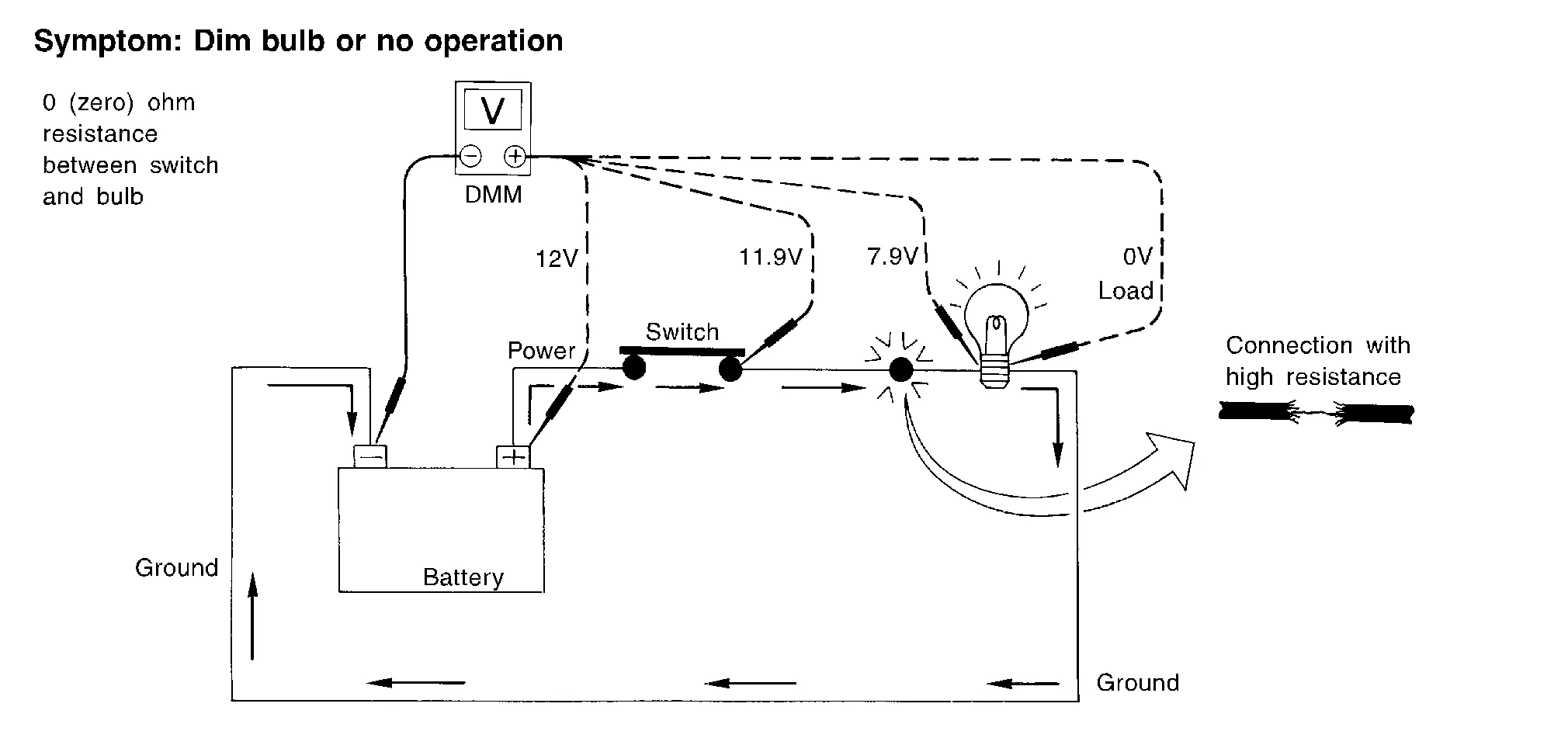 Check the wire in the illustration. When measuring resistance with DMM, contact by a single strand of wire will give reading of 0 ohms. This would indicate a good circuit. When the circuit operates, this single strand of wire is not able to carry the current. The single strand will have a high resistance to the current. This will be picked up as a slight voltage drop.