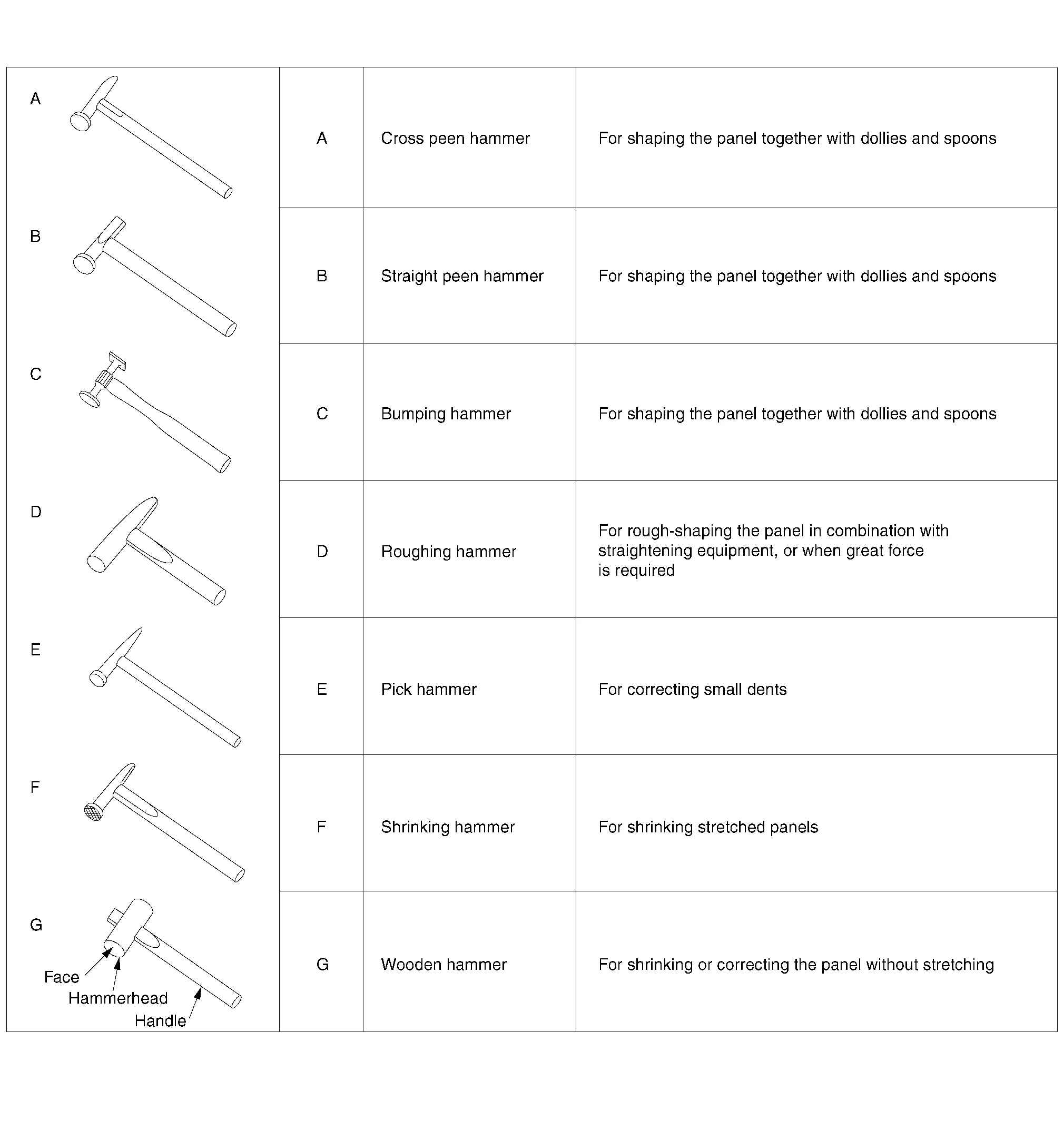 The precautions described for the hammer and dolly also apply to spoons. Do not damage the surface which comes into direct contact with the panel during repair work.