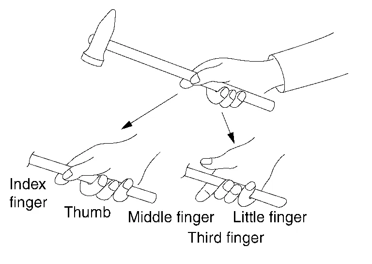 Hold the hammer handle tightly with the middle, third and little fingers so that it will not slip when it is swung.