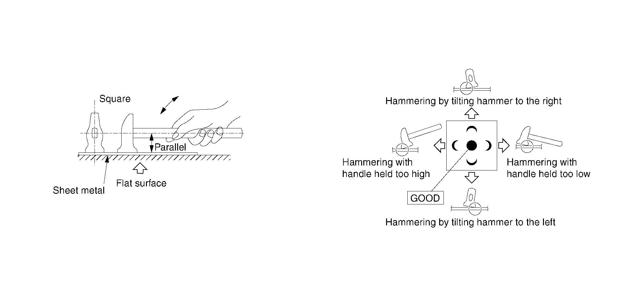 For ordinary correcting work, swing the hammer using the wrist. In this case, the arm serves as a guide to determine the hammer direction.