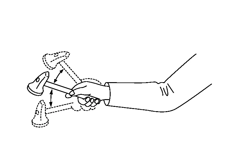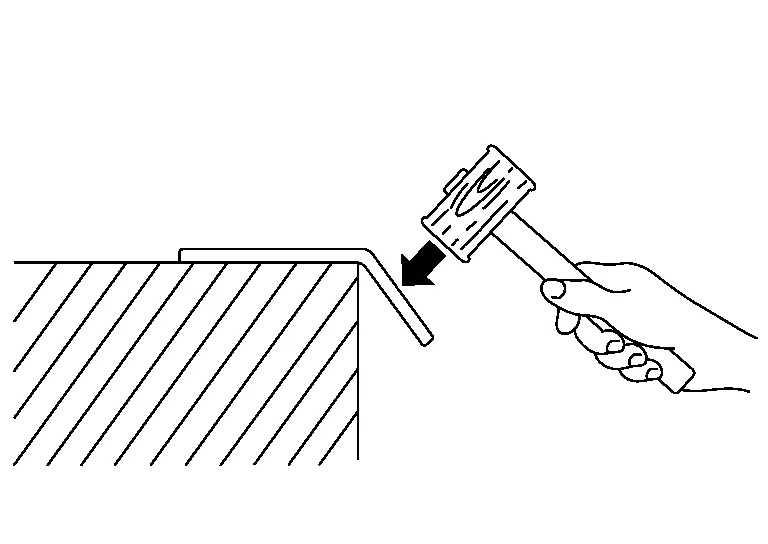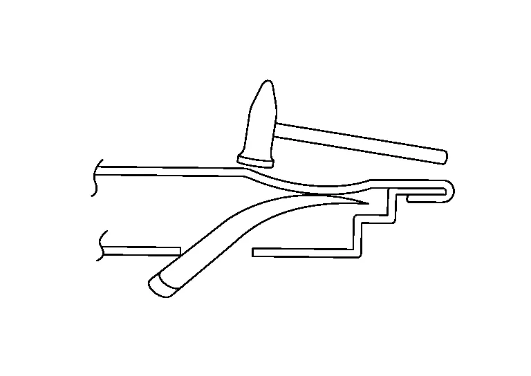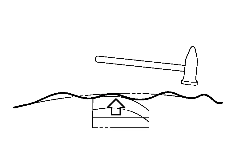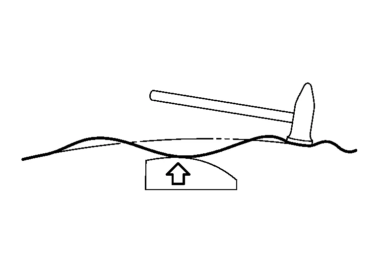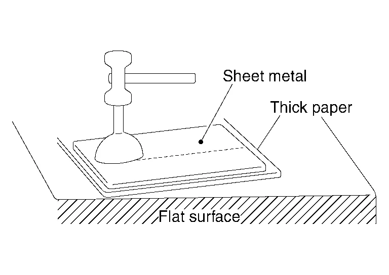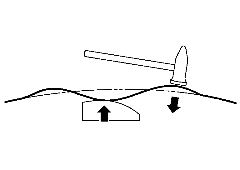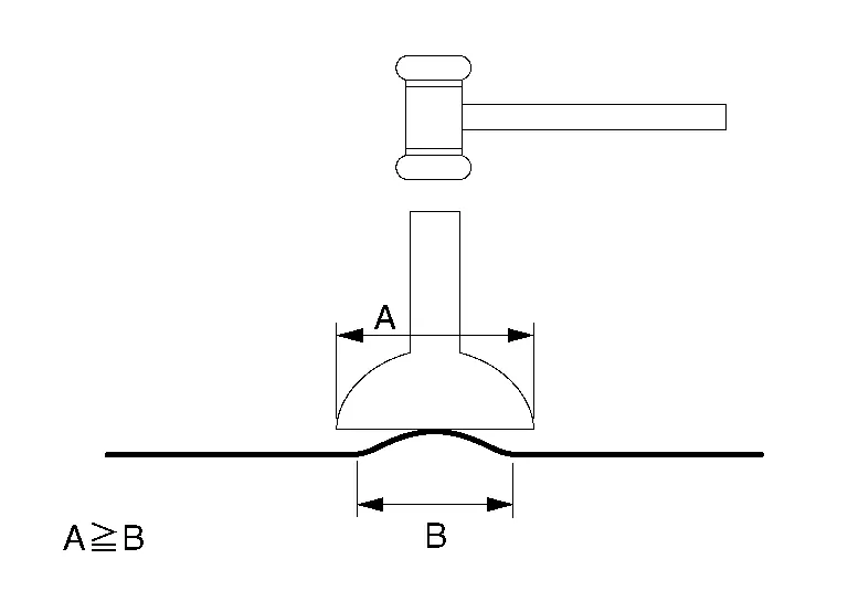 (b) Move the hammer and dolly as necessary, and direct the hammer blows so as to bend the sheet metal.