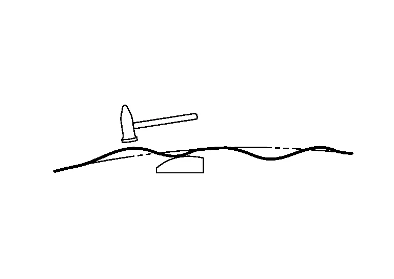 Hammering should be approximately 100 hits a minute, and should be kept constant. An irregular hammering rhythm will lead to an uneven hammering force. Sheet metal will stretch when it is hammered. Irregular hammering also makes sheet metal correction more difficult.
