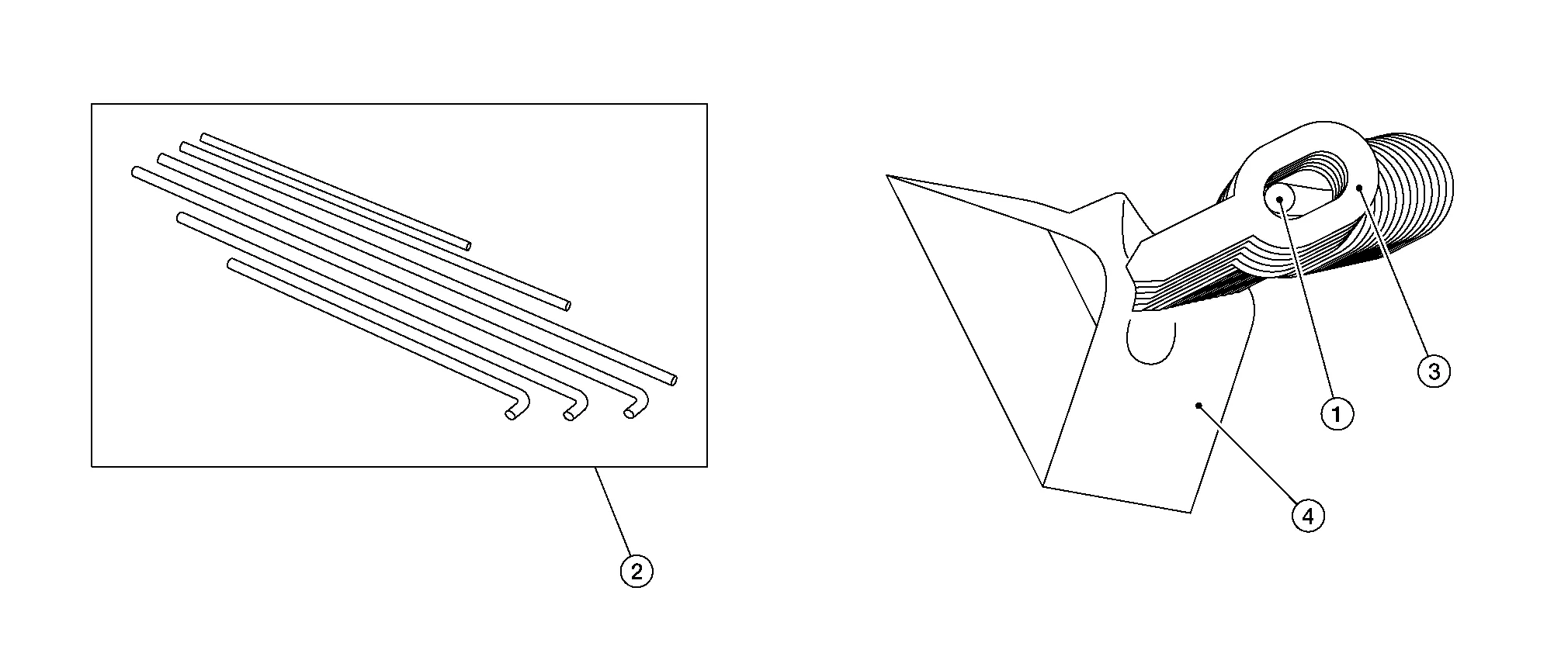 Insert the pulling bar (1). There are 6 different types of pulling bars (2): three different lengths and also either straight or bent at the end. The bent pulling bars are for vertical applications.