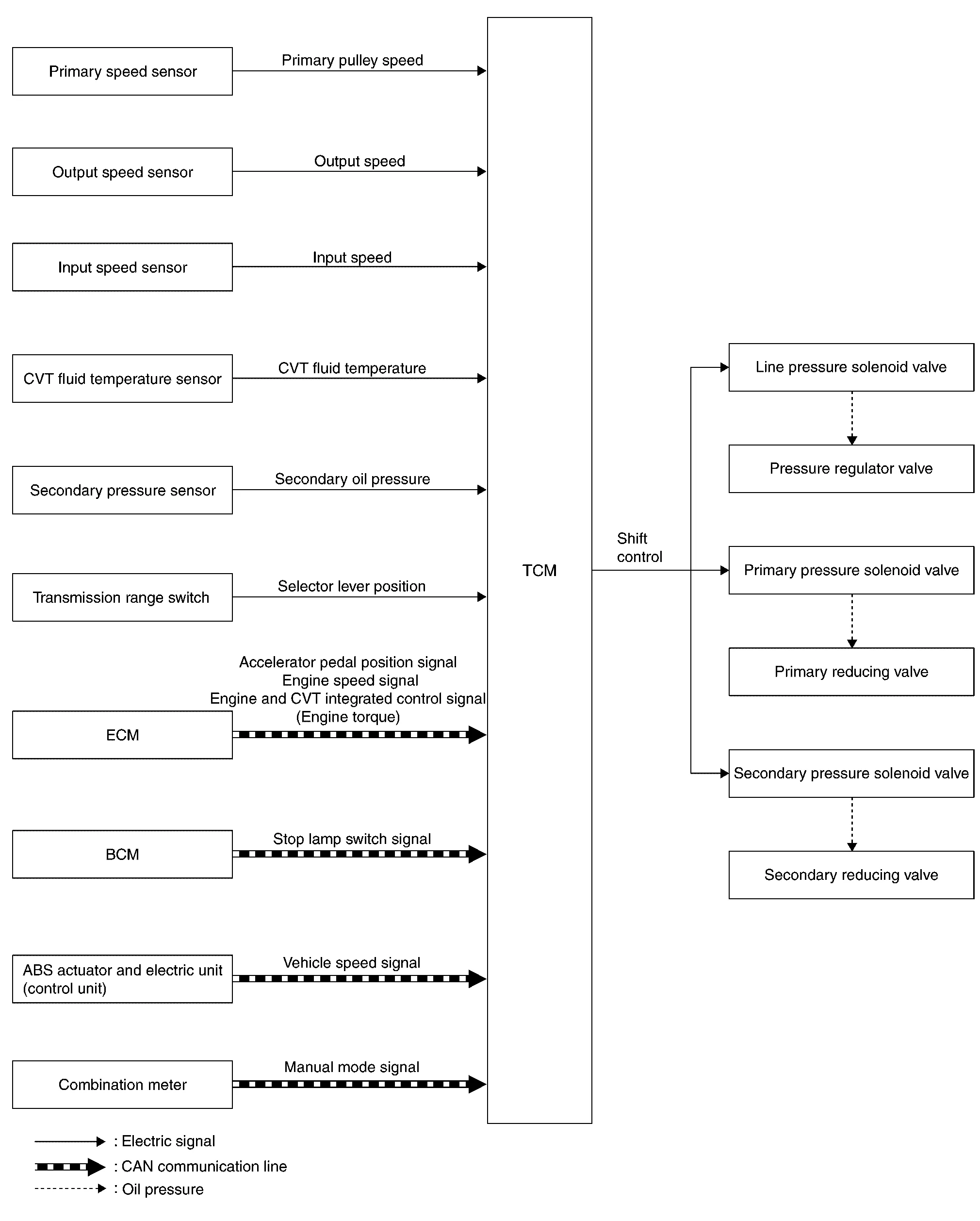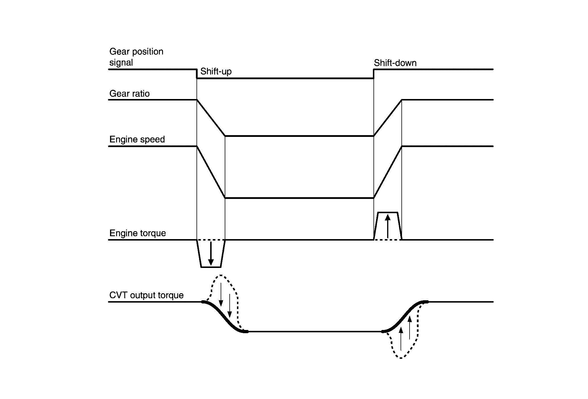 The TCM transmits the manual mode shift refusal signal to the combination meter if the TCM refuses the transmission from the driving status of Nissan Murano vehicle when the selector lever shifts to UP side (+ side) or DOWN side (−side). The combination meter blinks shift indicator on the combination meter and sounds the buzzer to indicate the driver that the shifting is not performed when receiving this signal. However, the TCM does not transmit the manual mode shift refusal signal in the conditions as per the following.
