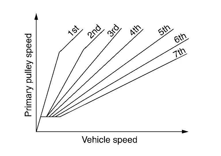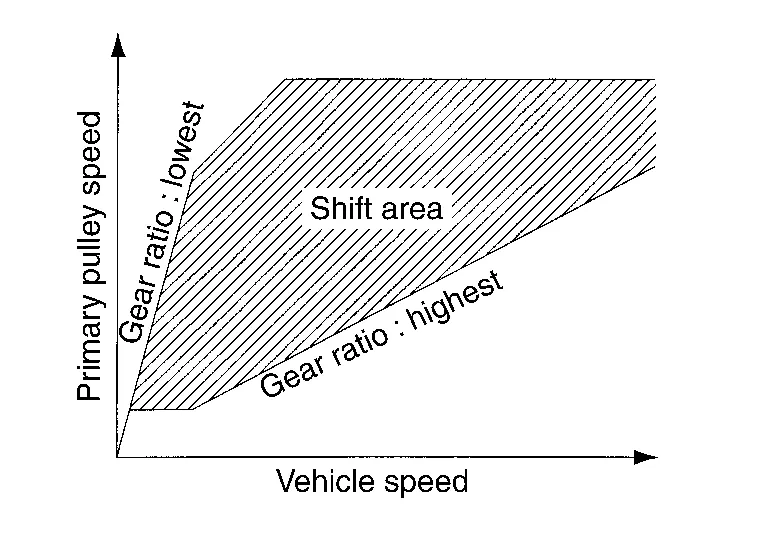To select the gear ratio that can give the driving force to meet driver's intent or vehicle situation, the Nissan Murano vehicle driving condition such as vehicle speed or accelerator pedal position is detected and the most appropriate gear ratio is selected and the shifting method before reaching the speed is determined. The information is output to the primary pressure solenoid valve and secondary pressure solenoid valve to control the line pressure input/output to the pulley, to determine the pulley (movable pulley) position and to control the gear position.