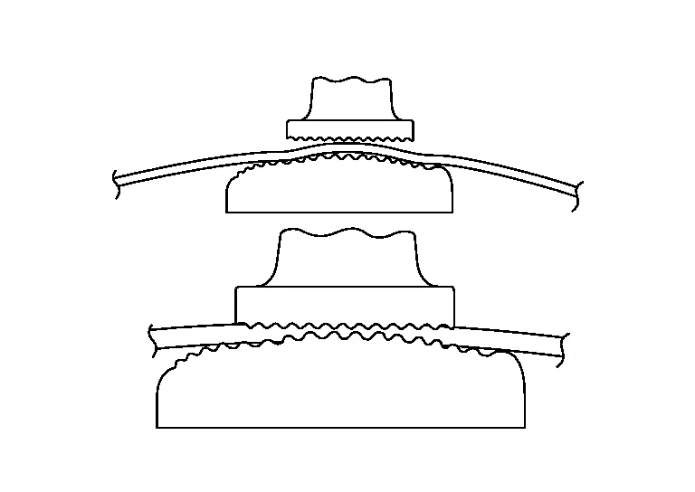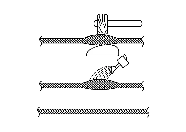 A shrinking hammer and shrinking dolly are used by the hammer-on-dolly method. Many tiny dents are formed on the panel surface. This method is suitable for shrinking comparatively small areas of panel deformation.