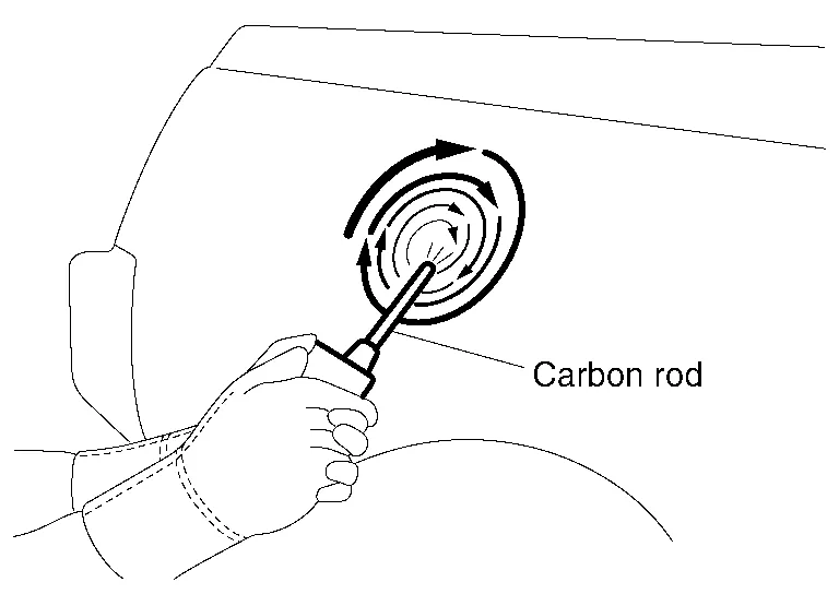 The panel is connected to the negative power supply terminal and a carbon rod is connected to the positive terminal. The panel is heated so that heat is conducted from the outside to the center of the dent. Wet rags are then applied to cool it quickly, thus shrinking the panel.