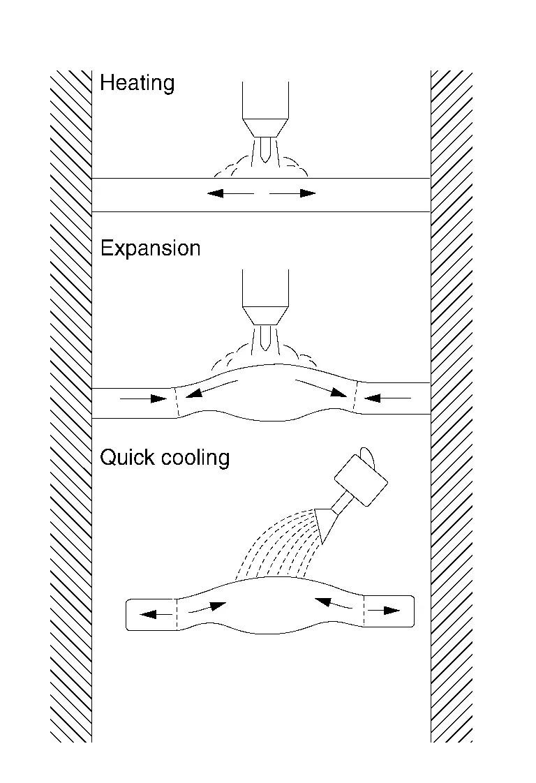 However, stretching is restricted in the unheated surrounding portion. As a result, the heated portion bulges.