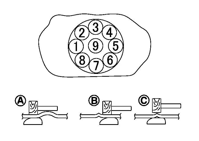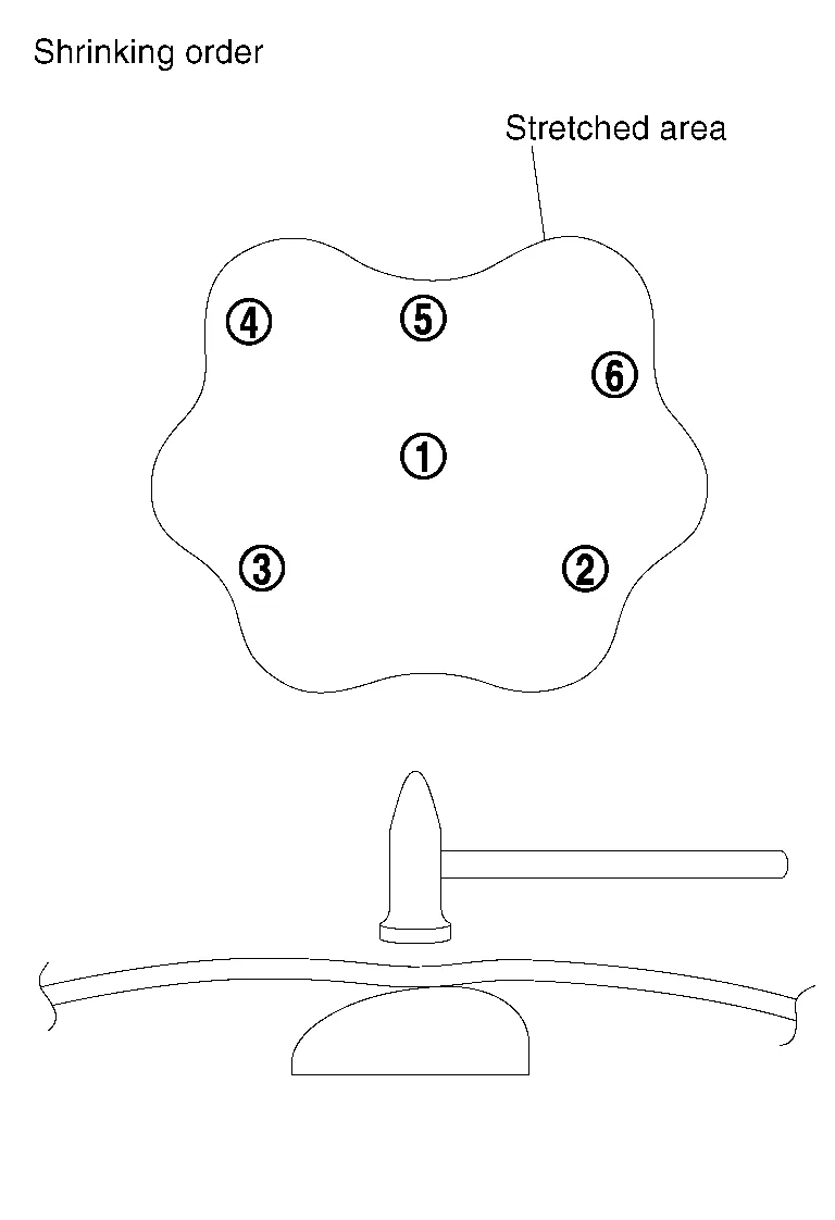 Apply a dolly to the back of the heated panel. Tap the panel with a wooden hammer using the hammer-ondolly method in the sequence shown in the figure.