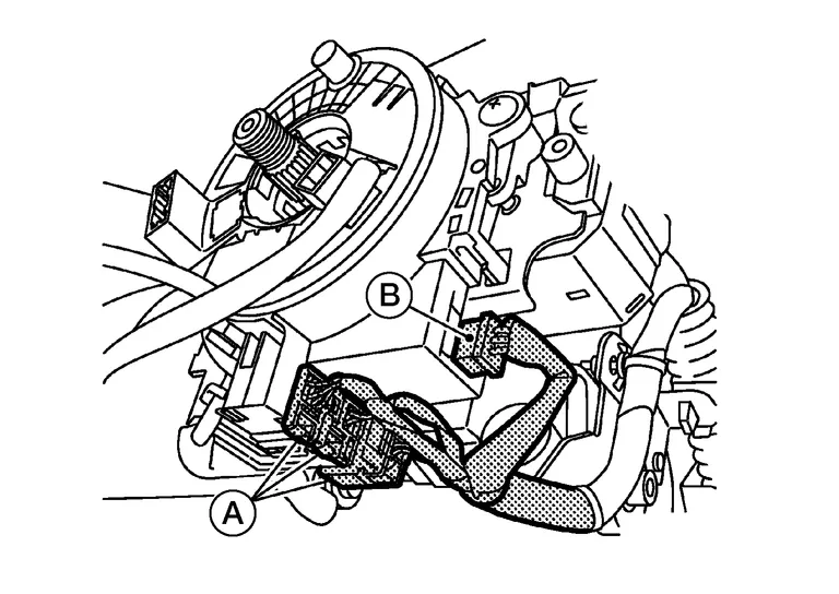 Disconnect harness connectors (A) from spiral cable and harness connector (B) from steering angle sensor.