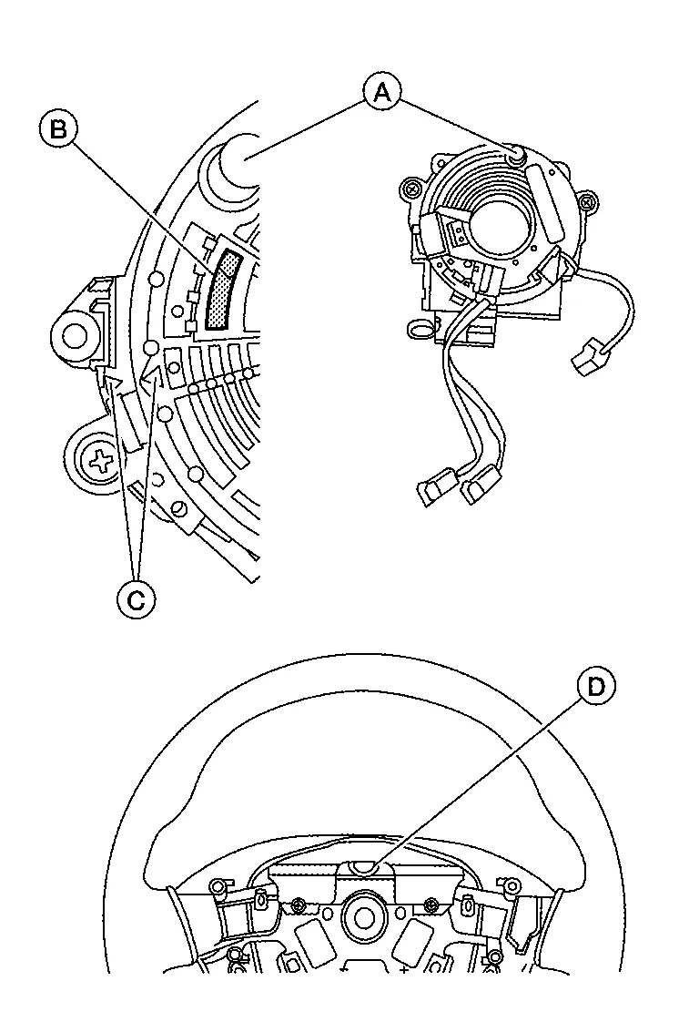 During steering wheel installation, make sure the locating pin hole (D) is aligned with the locating pin (A) of the spiral cable.