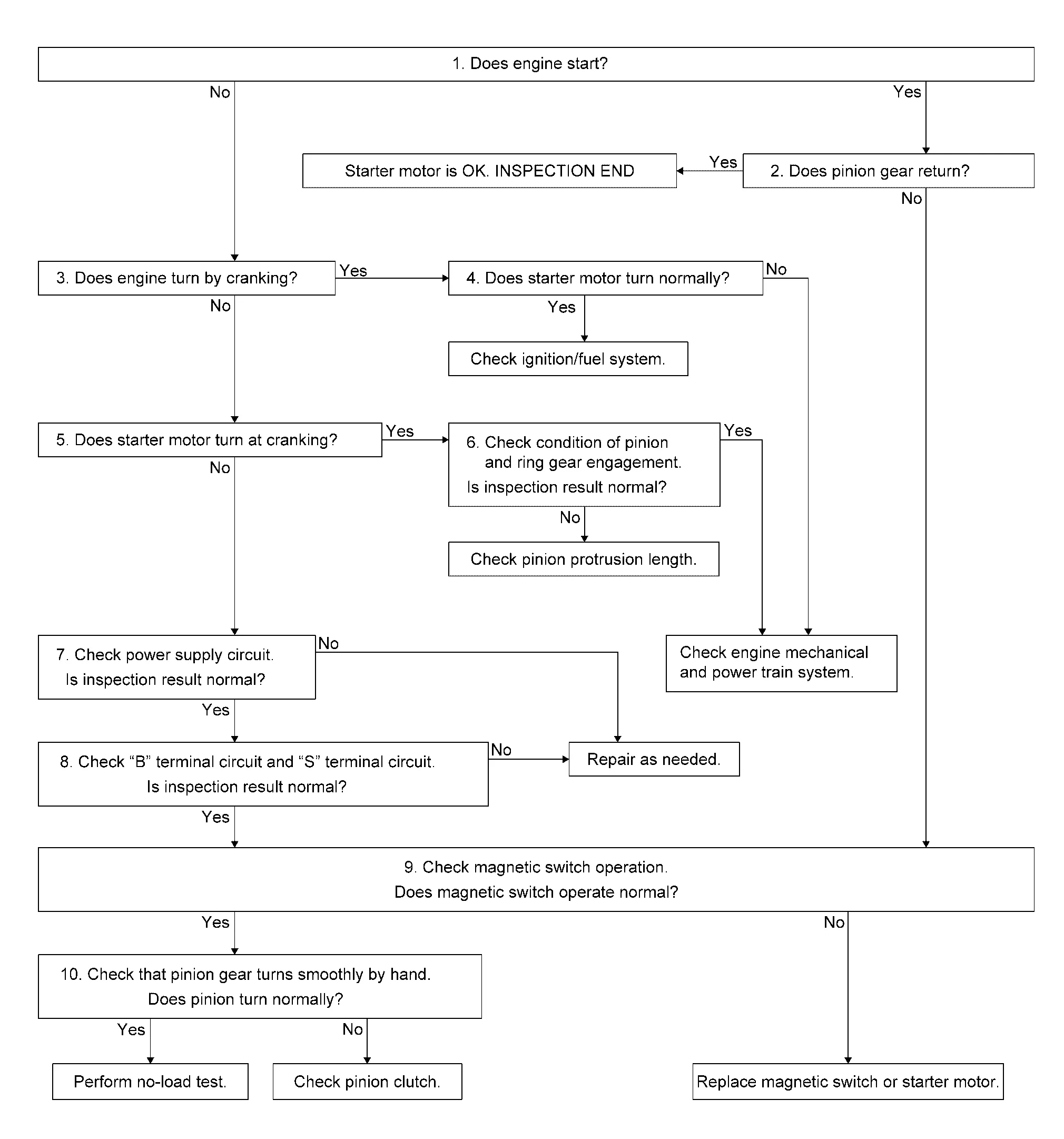 YES>>Perform no-load test of starter motor. Refer to Inspection.