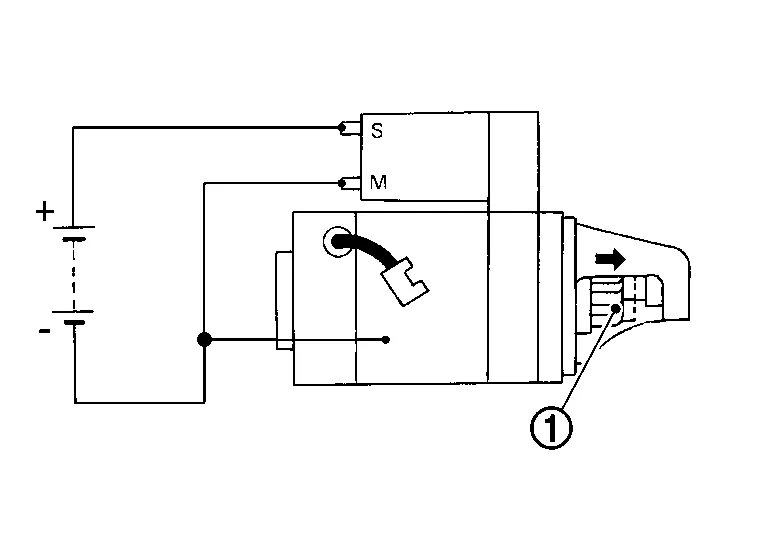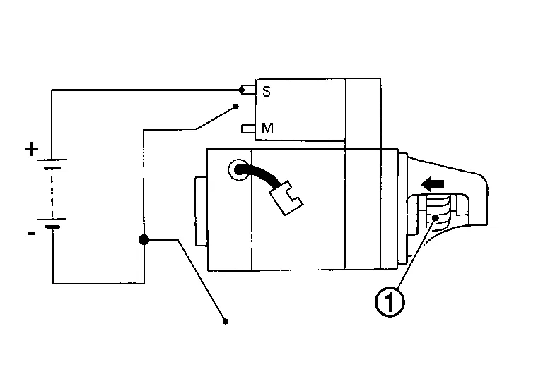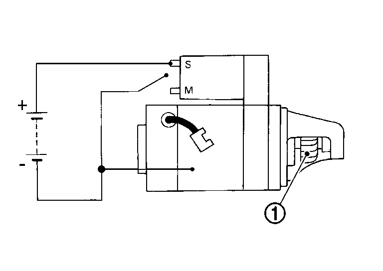 Disconnect (—) wire from starter motor body as shown. Check that pinion gear (1) returns to original position.