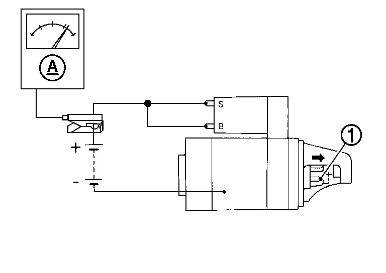 Connect 12V battery and ammeter to starter motor as shown. Check no load current with pinion gear (1) driven out and starter motor operating.