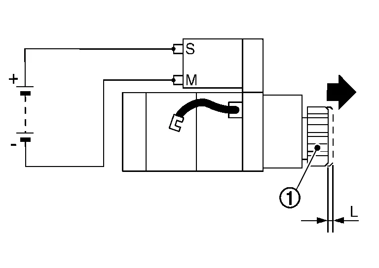 Compare movement "L" in height of pinion gear (1) when it is pushed out with magnetic switch energized and when it is pulled out by hand until it touches stopper.