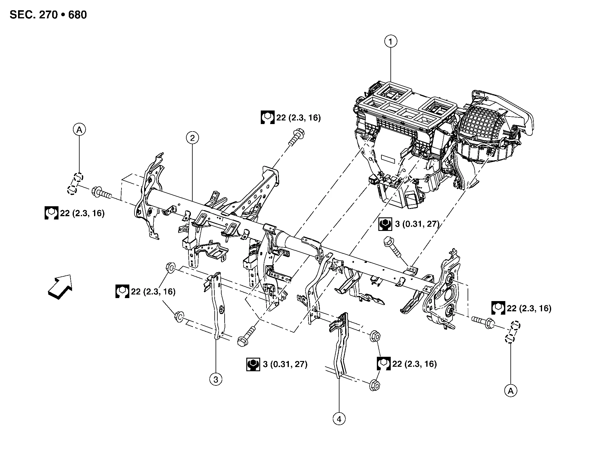 | 1. | Heating and cooling unit assembly | 2. | Steering member | 3. | Steering member brace (LH) |