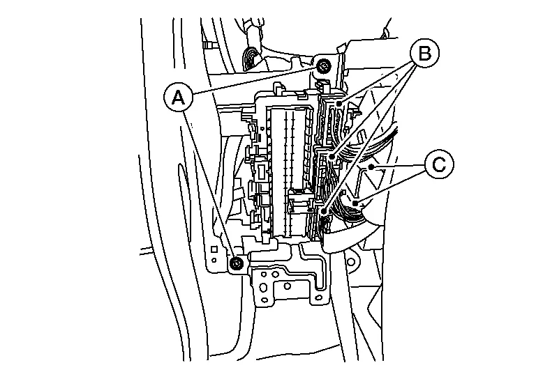 Disconnect harness connector from the shift selector assembly and release harness retainers.