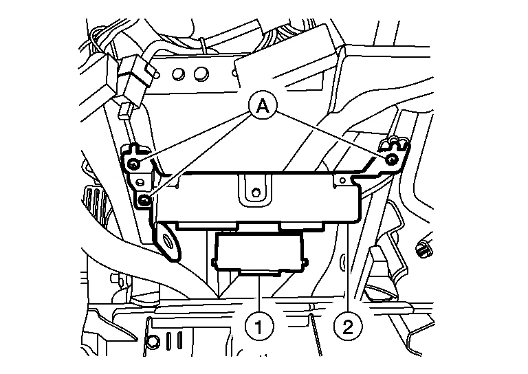 Remove screws (A) and the ADAS control unit (1) and the around view monitor control unit (2) as an assembly.