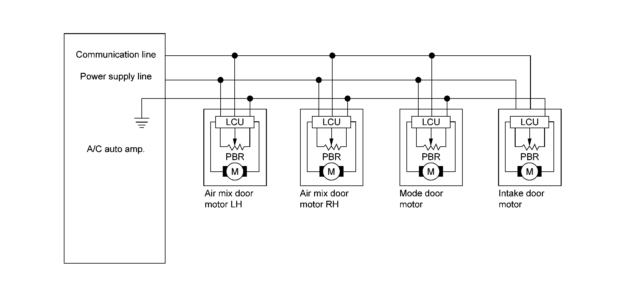 Each LCU controls each door to the appropriate position depending on the control signal from A/C auto amp.