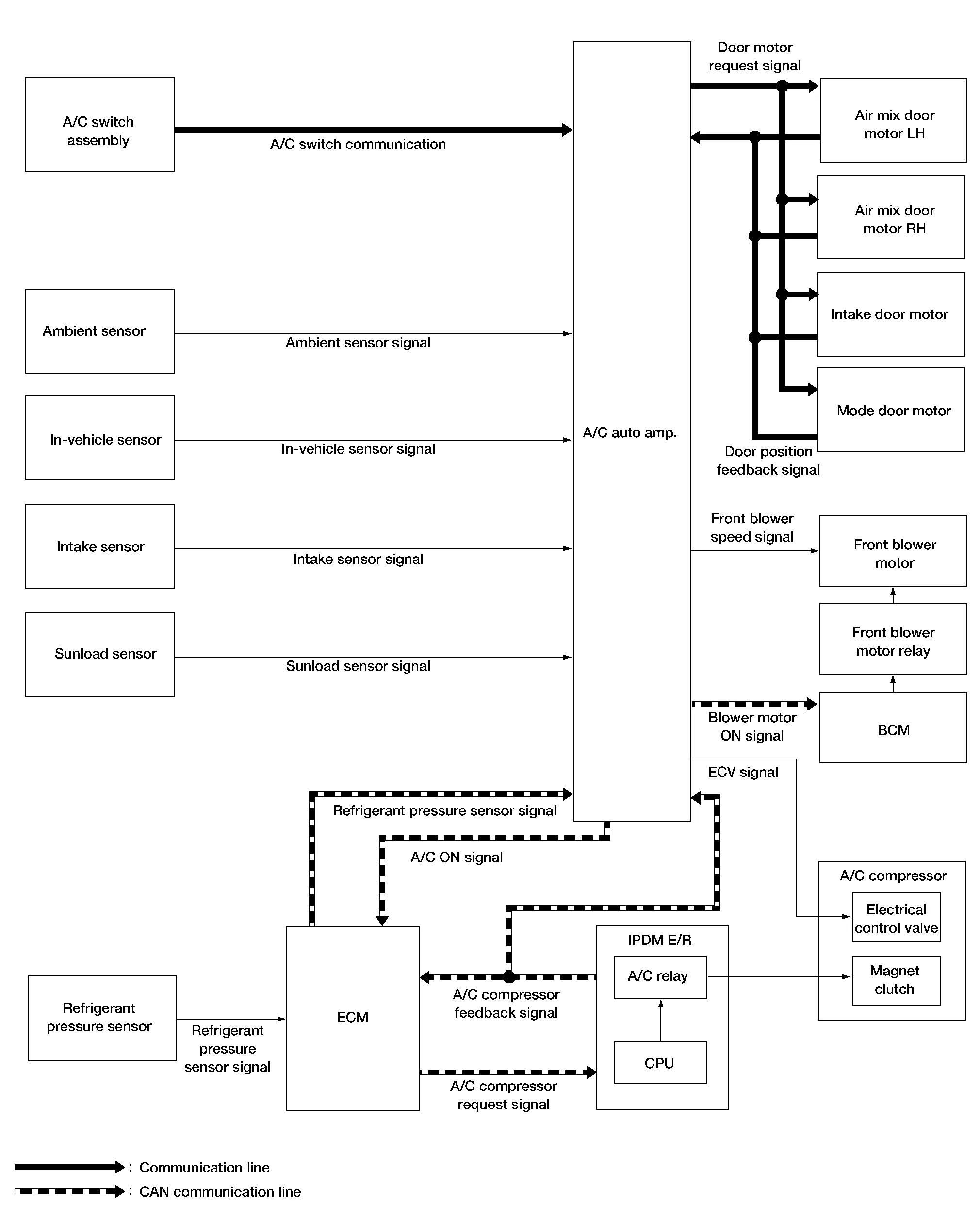 Automatic air conditioning system is controlled by each function of A/C auto amp., ECM, IPDM E/R and BCM.