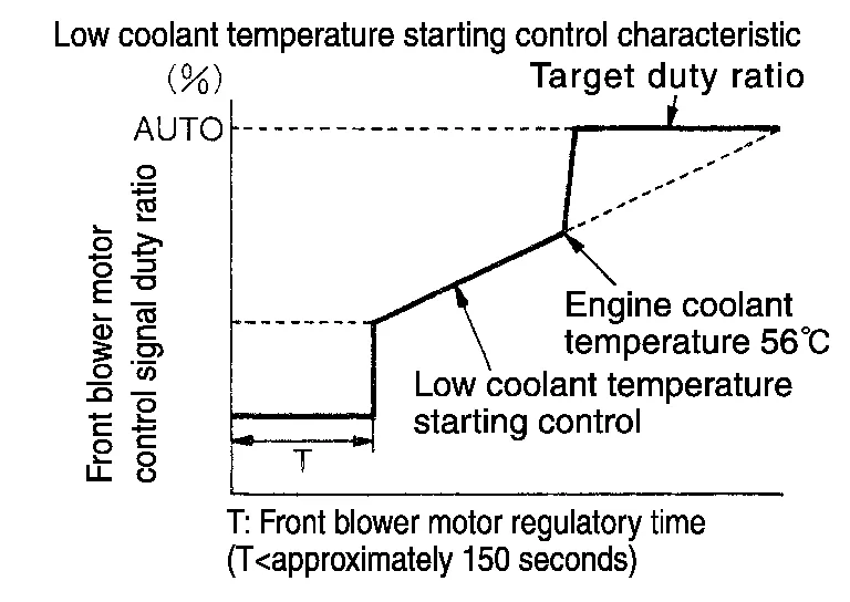 If the engine coolant temperature is 133°F (56°C) or less, to prevent a cold discharged air flow, A/C auto amp. suspends front blower motor activation for the maximum 150 seconds depending on target air mix door (front) opening angle. After this, front blower motor control signal is increased gradually, and front blower motor is activated.