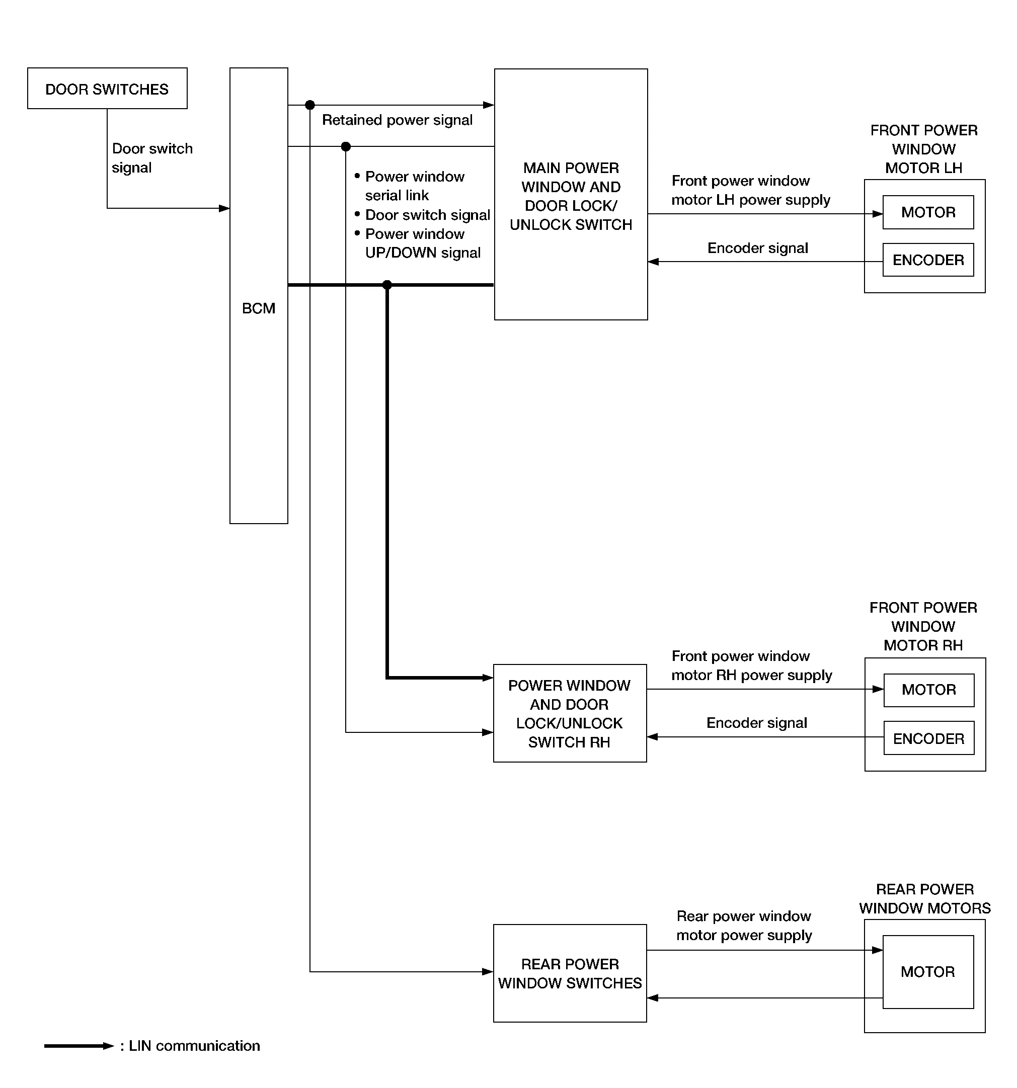 Main power window and door lock/unlock switch, power window and door lock/unlock switch RH and BCM transmit and receive the signal by power window serial link.