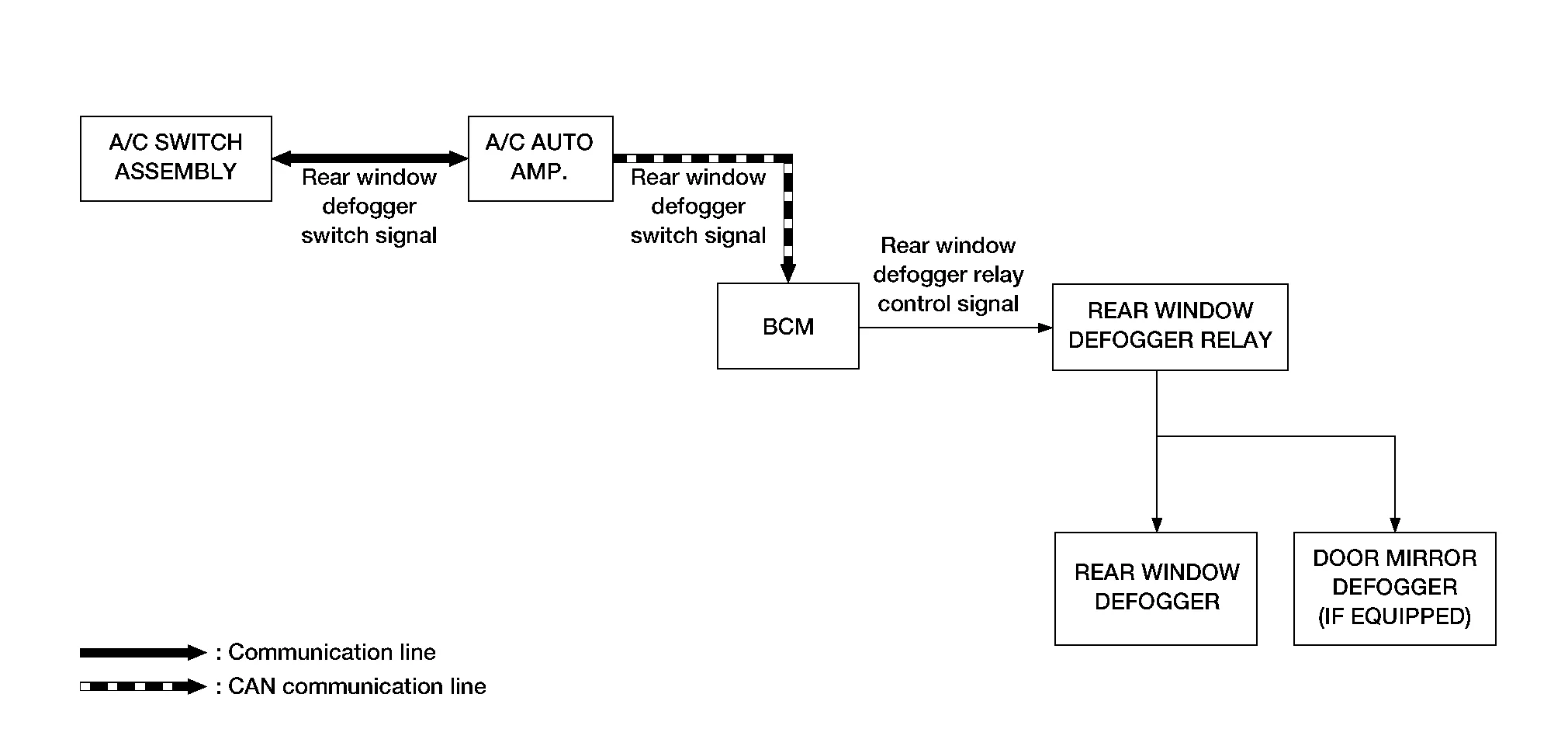 BCM transmits rear window defogger feedback signal to A/C auto amp. then communicates the signal to the A/C switch assembly when rear window defogger operates.